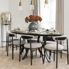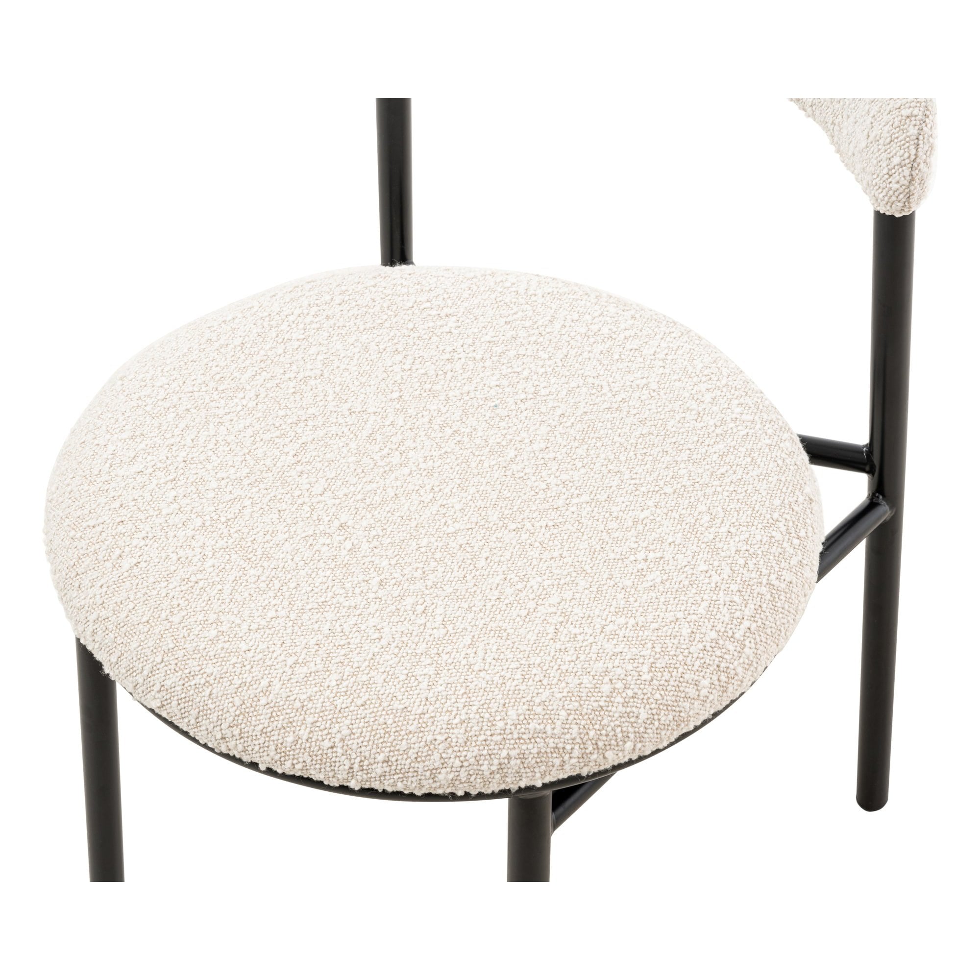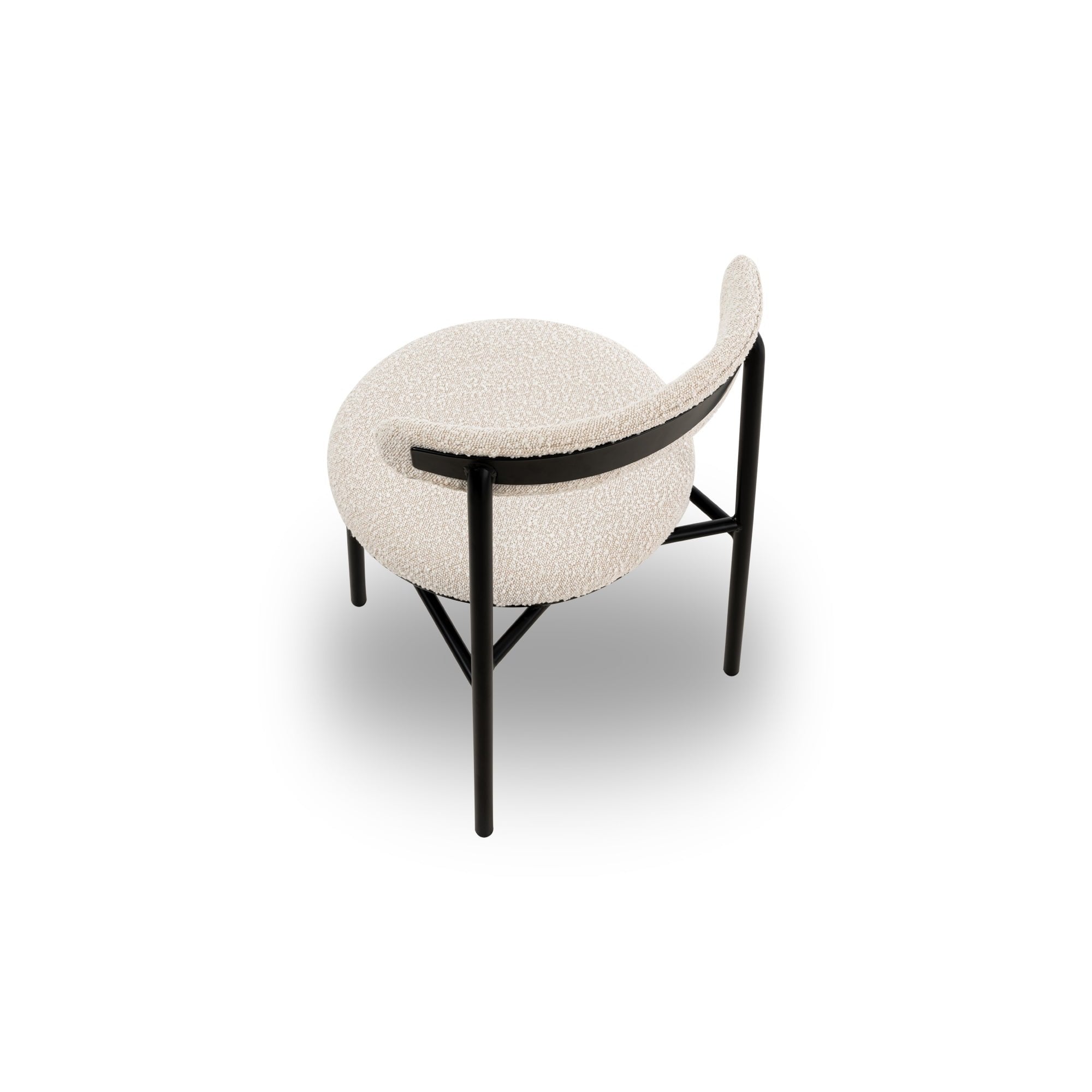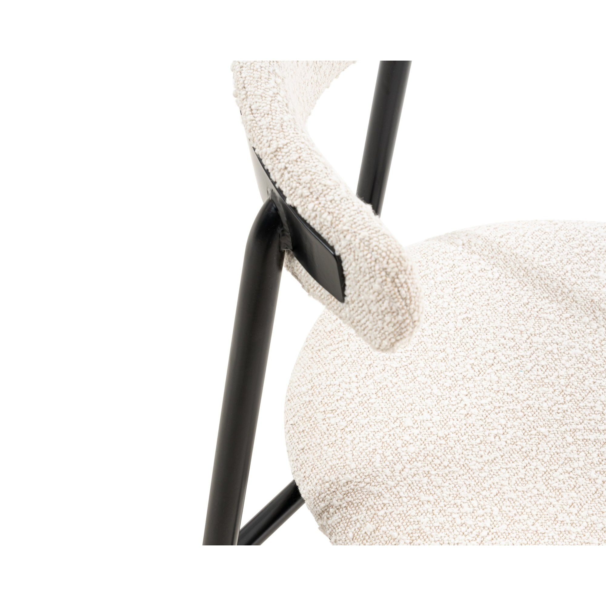 Elevate your dining experience with the Nook Dining Chairs, elegantly upholstered in soft boucle sand. Their sleek, rounded design in a matte black finish not only brings modern aesthetics to your space but also offers comfort and versatility. Perfect for both home dining rooms and hospitality settings, these chairs exude subtle elegance.