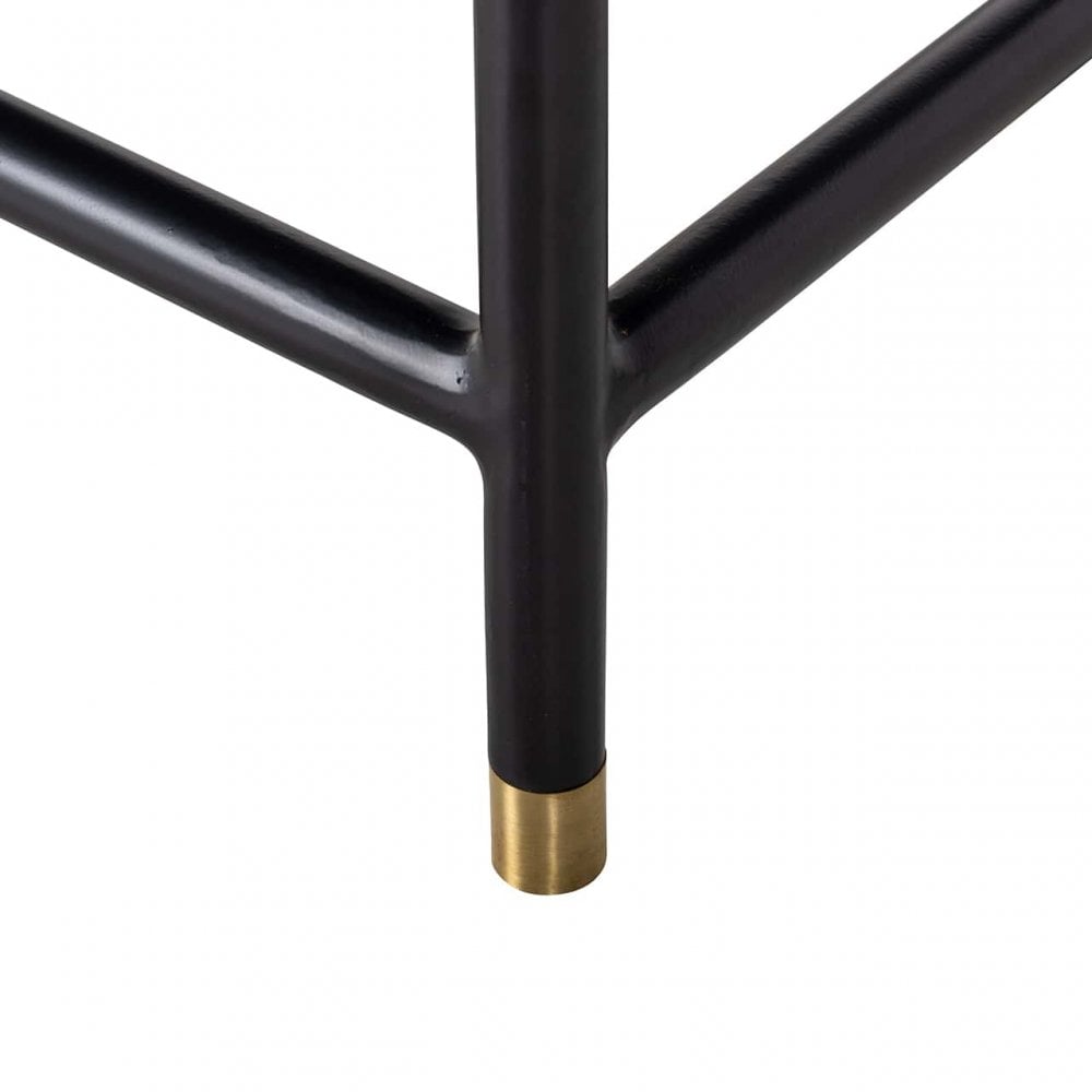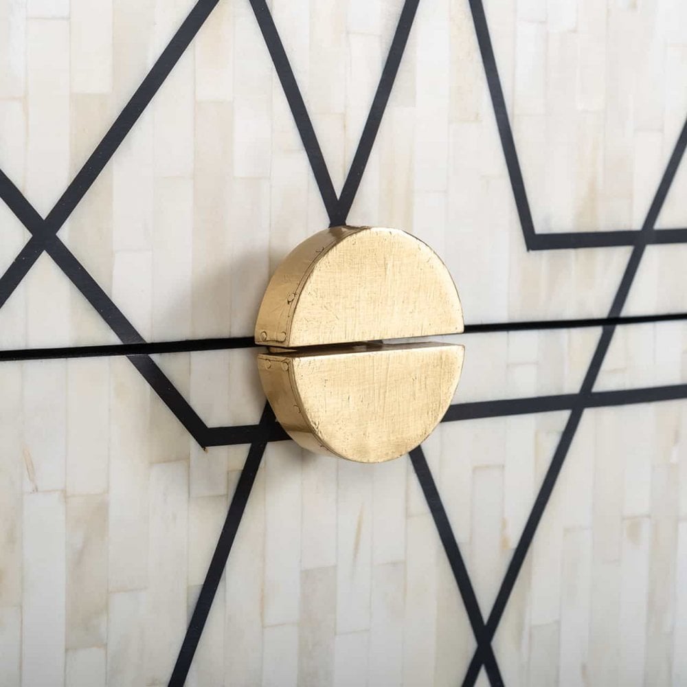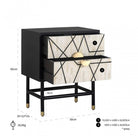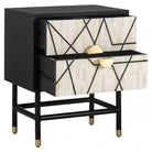 The Novas Bedside Table from Richmond Interiors offers a luxurious style that adds elegant beauty to your bedroom. Made from rich black mango wood, this chic piece is supported by sleek iron legs, providing an air of sophistication. The front is adorned with animal bone inlay, featuring a bold geometric pattern that makes it a striking focal point in any room. With two generously sized drawers for storage and brass-capped feet and semi-circular handles, it exudes opulence. The Novas Bedside Table is the perfect addition to your bedroom.
