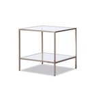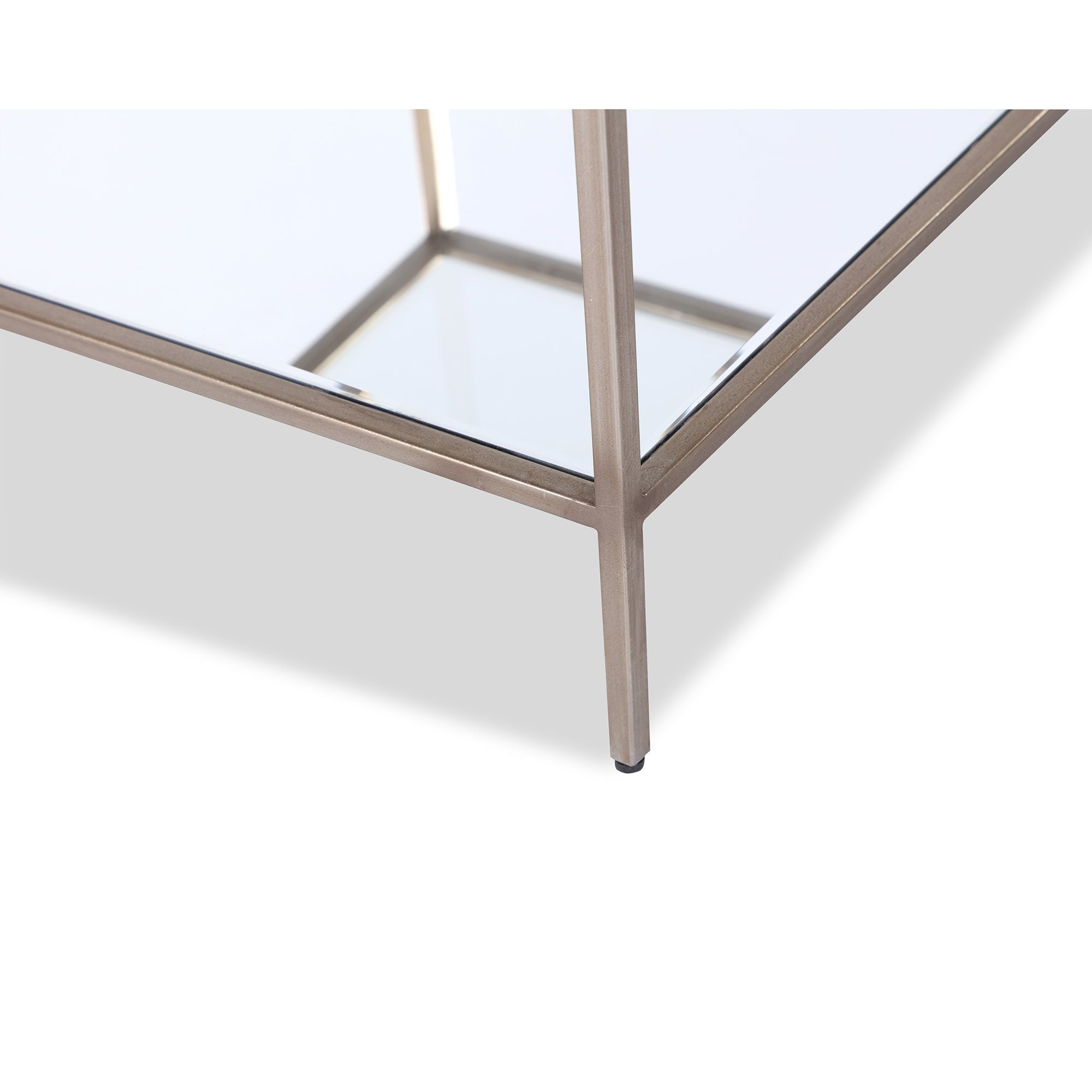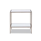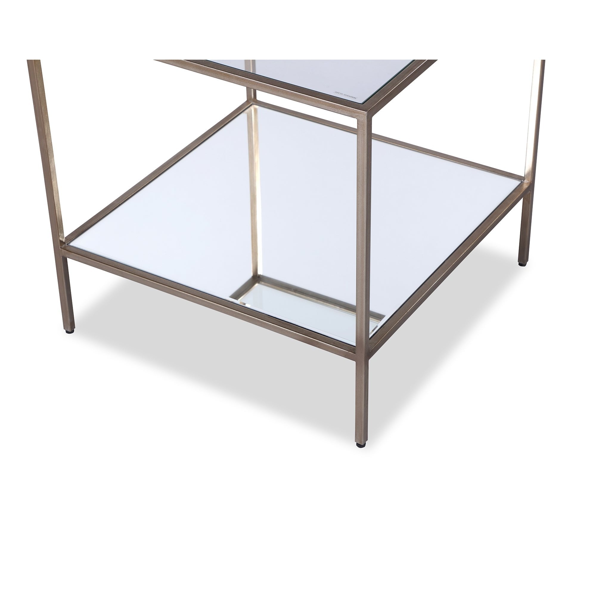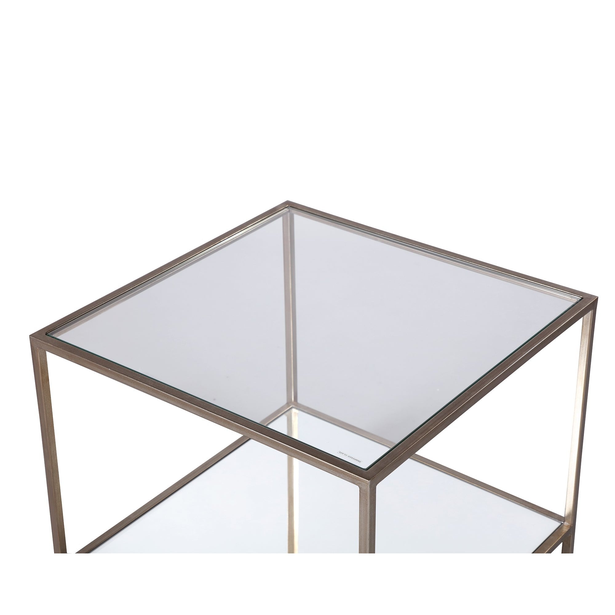 The Oliver Side Table is a sophisticated addition to any interior, showcasing a clear tempered glass top with a mirrored undertier, elegantly framed in antique silver-finished steel. Perfect for placing beside a sofa or bed, this versatile and modern design blends rustic charm with functionality, enhancing both residential and hospitality spaces.