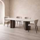 The Pari II Dining Chair set blends mid-century charm with contemporary elegance, making it a timeless choice for any dining space. Its gently curved silhouette offers a nod to classic design, while the sleek black legs and clean lines bring a modern edge. Upholstered in a soft concrete grey fabric, these chairs add a warm, inviting tone that complements a wide range of interior styles.