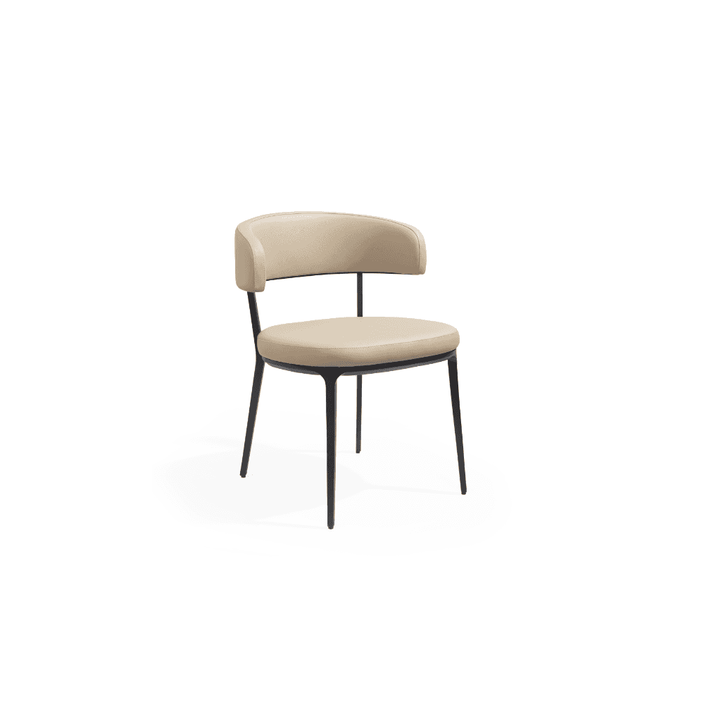 The Satori Dining Chair combines refined elegance with a classy and sleek silhouette, making it a sophisticated choice for any dining setting. Its rounded upholstered backrest provides comfortable support, while the sandblasted black legs with a tapered bevel add a touch of modern sophistication. The chair's design effortlessly merges style and comfort, resulting in a piece that enhances any interior with its understated yet distinguished charm. The Satori Dining Chair is a perfect blend of refined aesthetics and practical elegance, ideal for those seeking a timeless addition to their dining space.