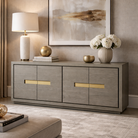 The Sevilla Four Door Sideboard by Berkeley Designs is a sophisticated statement piece, beautifully crafted in a textured grey and taupe oak veneer that brings warmth and depth to contemporary interiors. Designed with clean architectural lines and finished with striking brass handles, this elegant sideboard effortlessly blends modern luxury with timeless appeal.