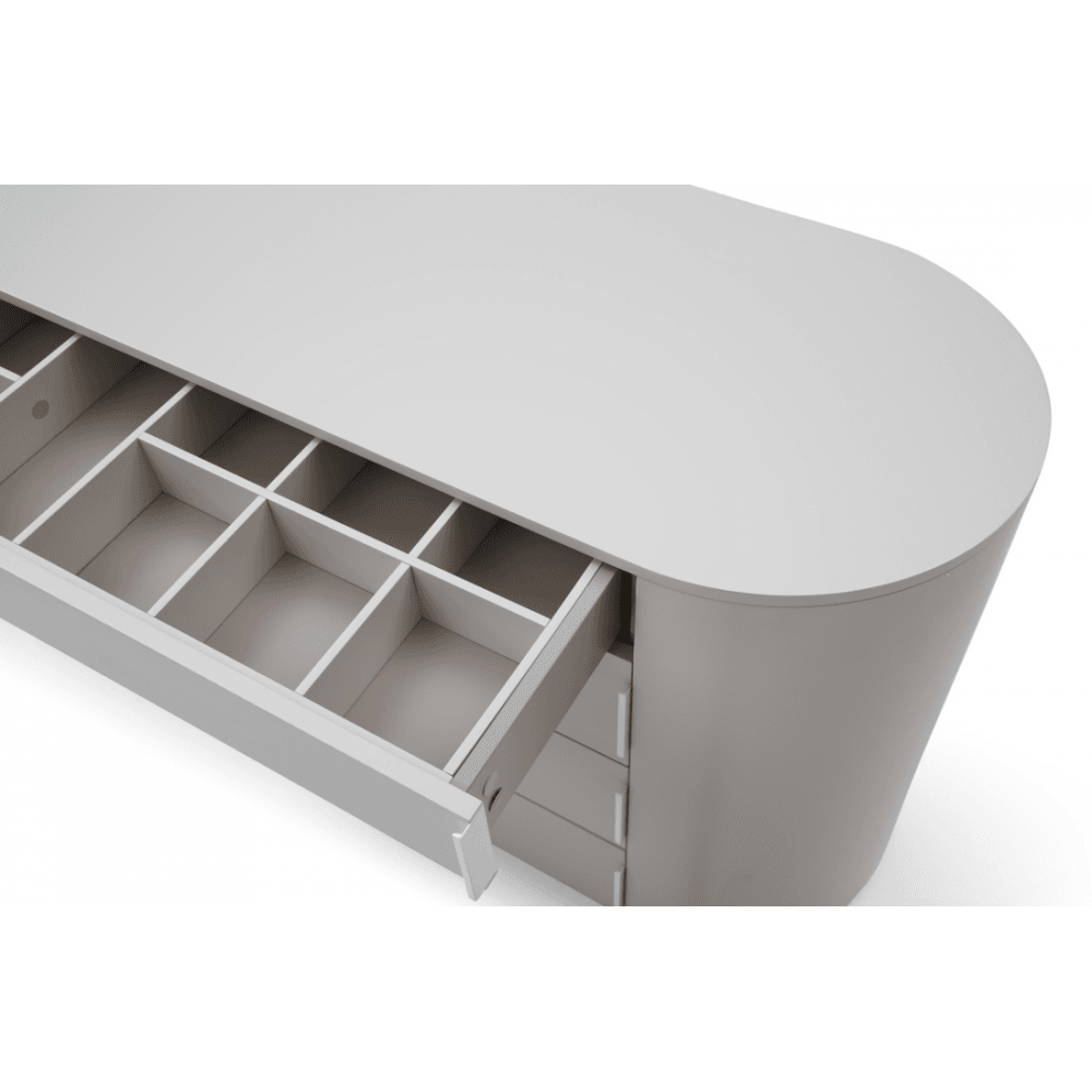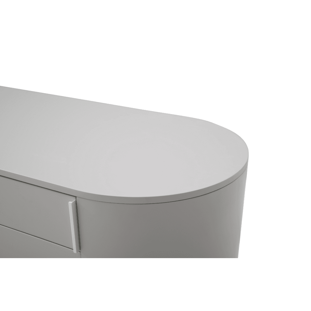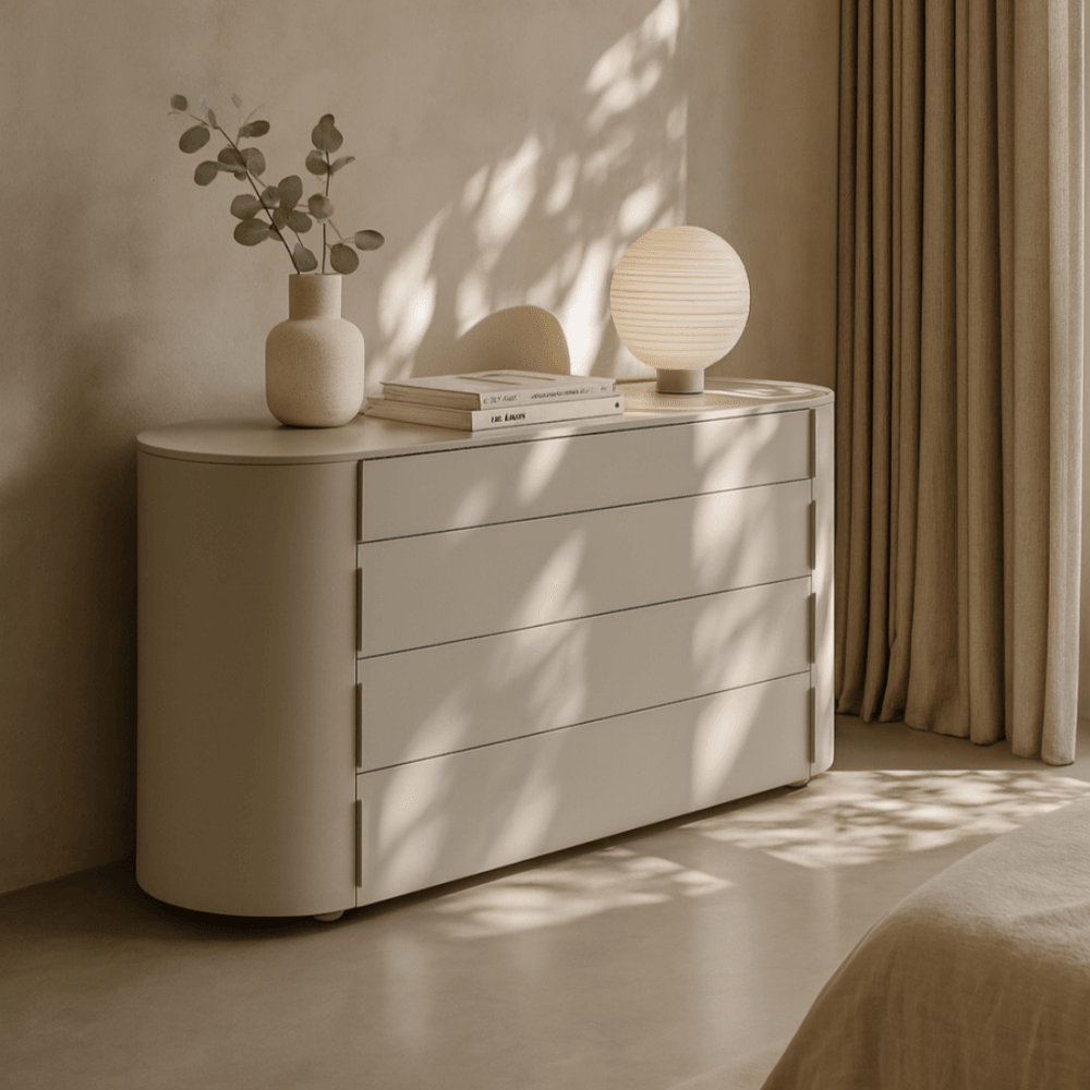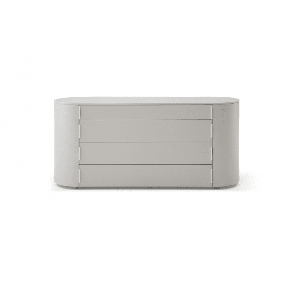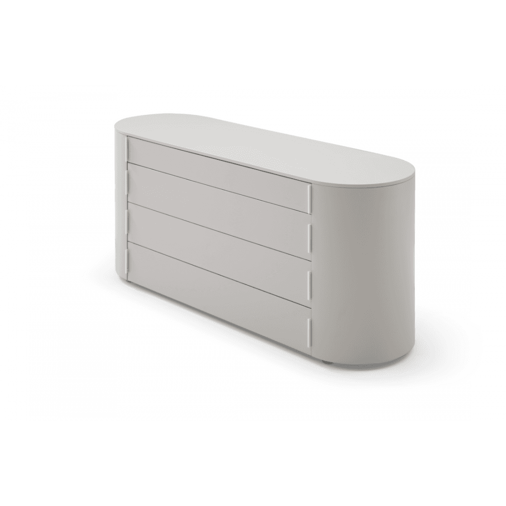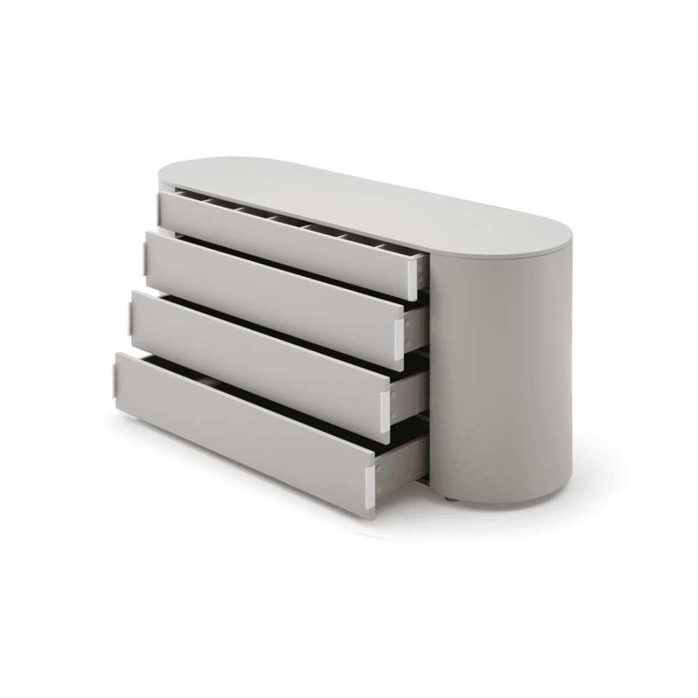 The Sims Dresser embodies contemporary elegance with its chic design and fresh appeal. Its soft curves and long oval shape exude sophistication, while the matte beige finish adds a touch of modernity to any bedroom decor. Crafted for both style and functionality, it features top drawer compartments for convenient organisation and four spacious drawers for ample storage, seamlessly blending practicality with sleek aesthetics.
