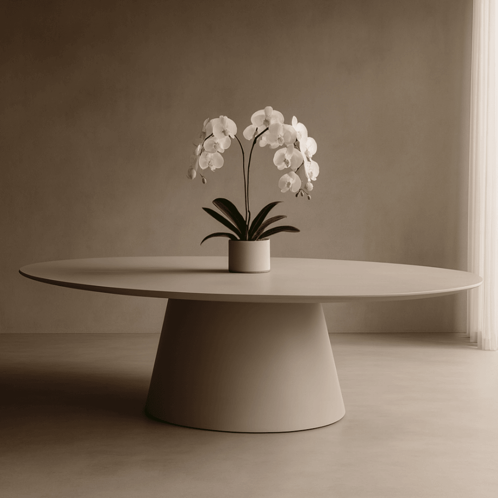 The Tavamo Dining Table is a statement in refined contemporary design, crafted to bring warmth and sophistication to any dining space. Its oval silhouette, finished in a matte beige lacquer, strikes a perfect balance between elegance and modernity. The soft, muted tone enhances its sculptural form, creating a captivating centrepiece that feels both timeless and distinctive. Generous in scale, the elongated surface provides ample room for beautifully styled place settings, shared meals, and memorable conversations. More than just a dining table, the Tavamo is designed to inspire connection, elevating everyday dining into an experience of style and comfort.