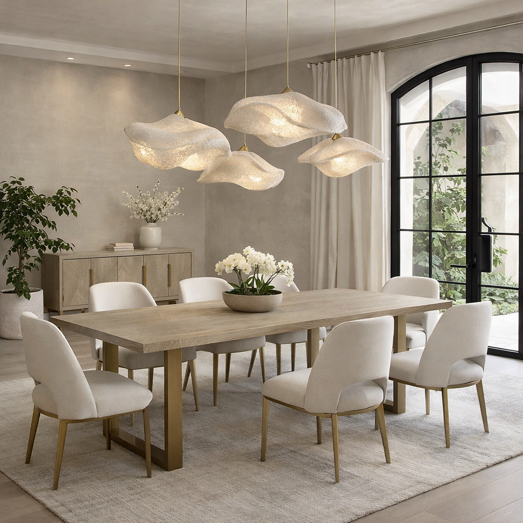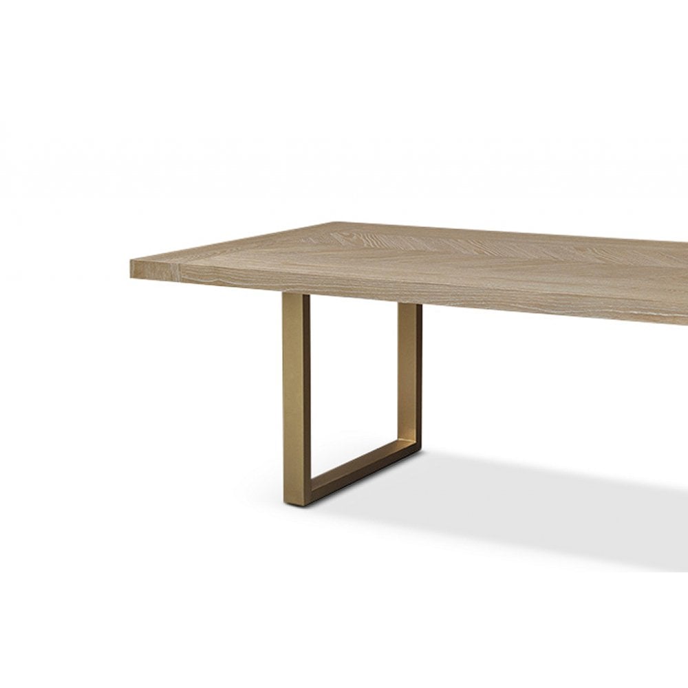 Its striking brass “U” shaped legs create a bold contrast against the soft grey oak tones, offering a sophisticated balance of warmth and modern structure. The sculptural base not only enhances visual impact but also provides sturdy support, making the Valencia Dining Table as practical as it is stylish.