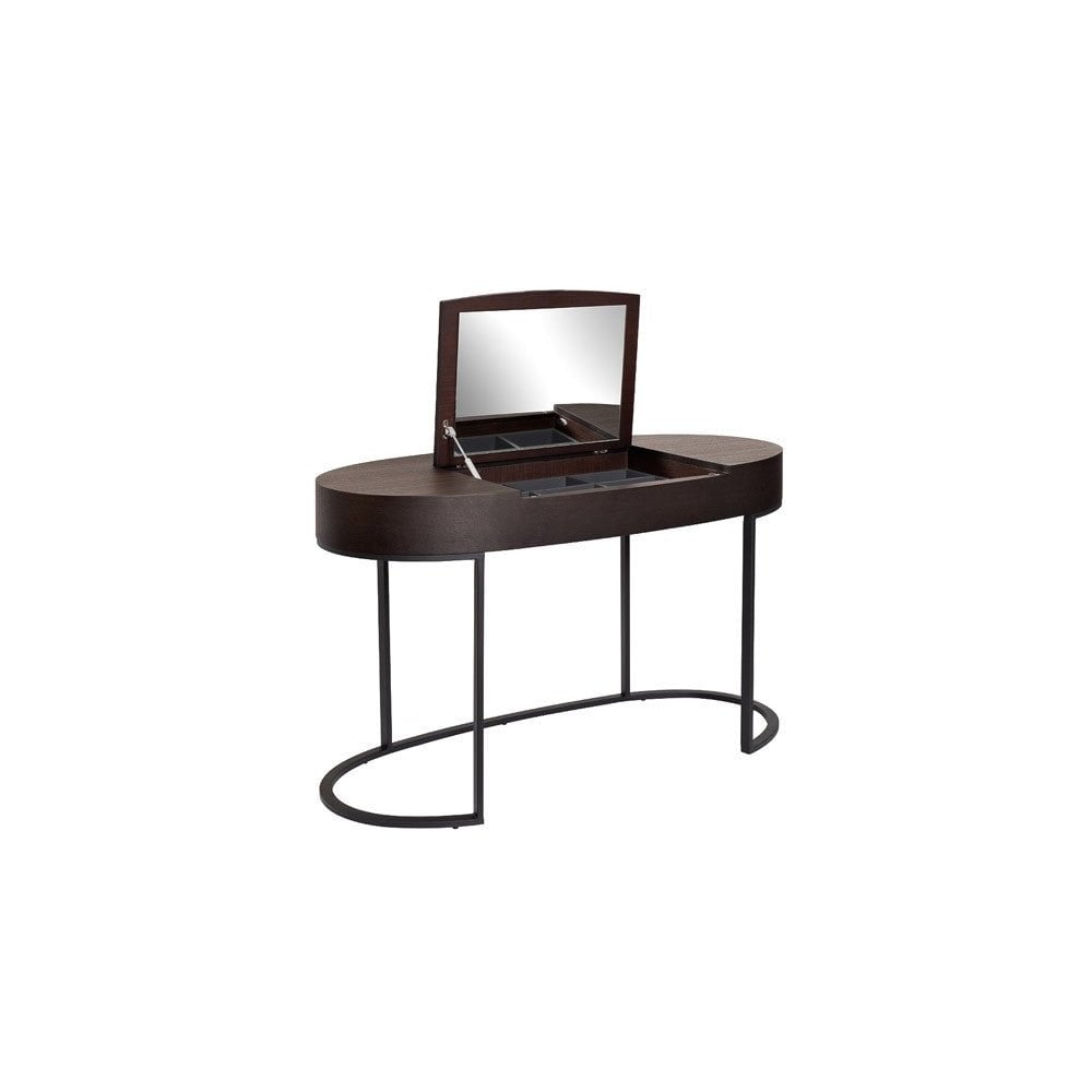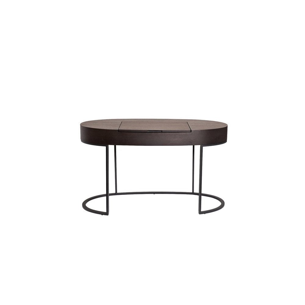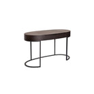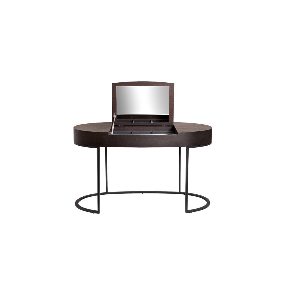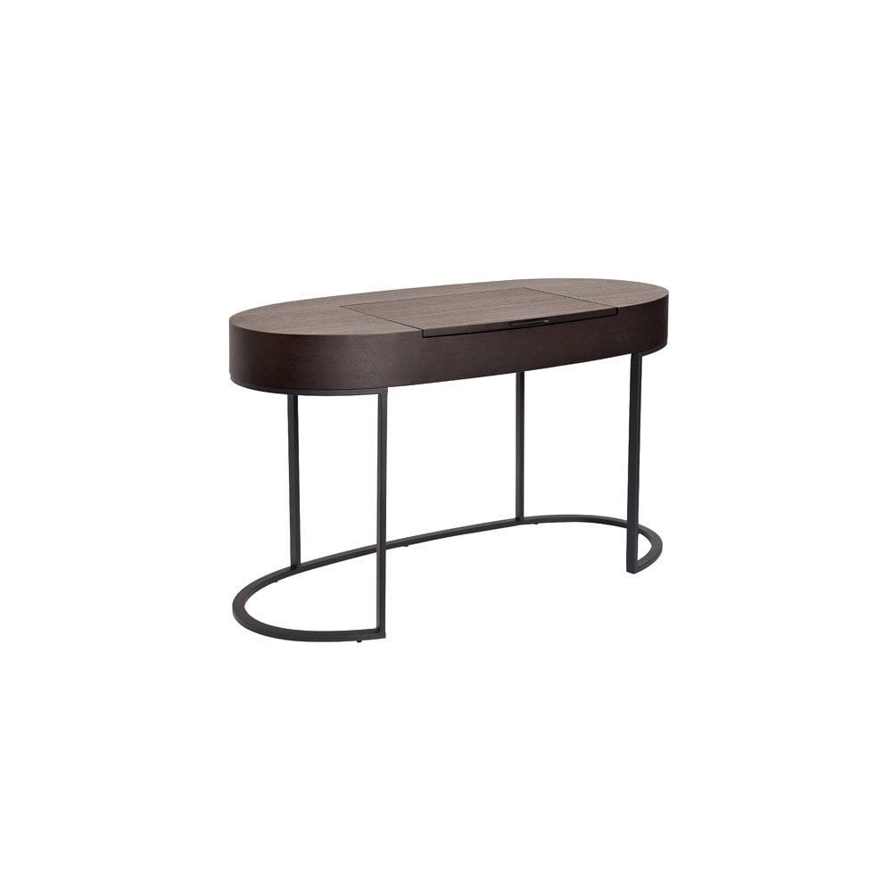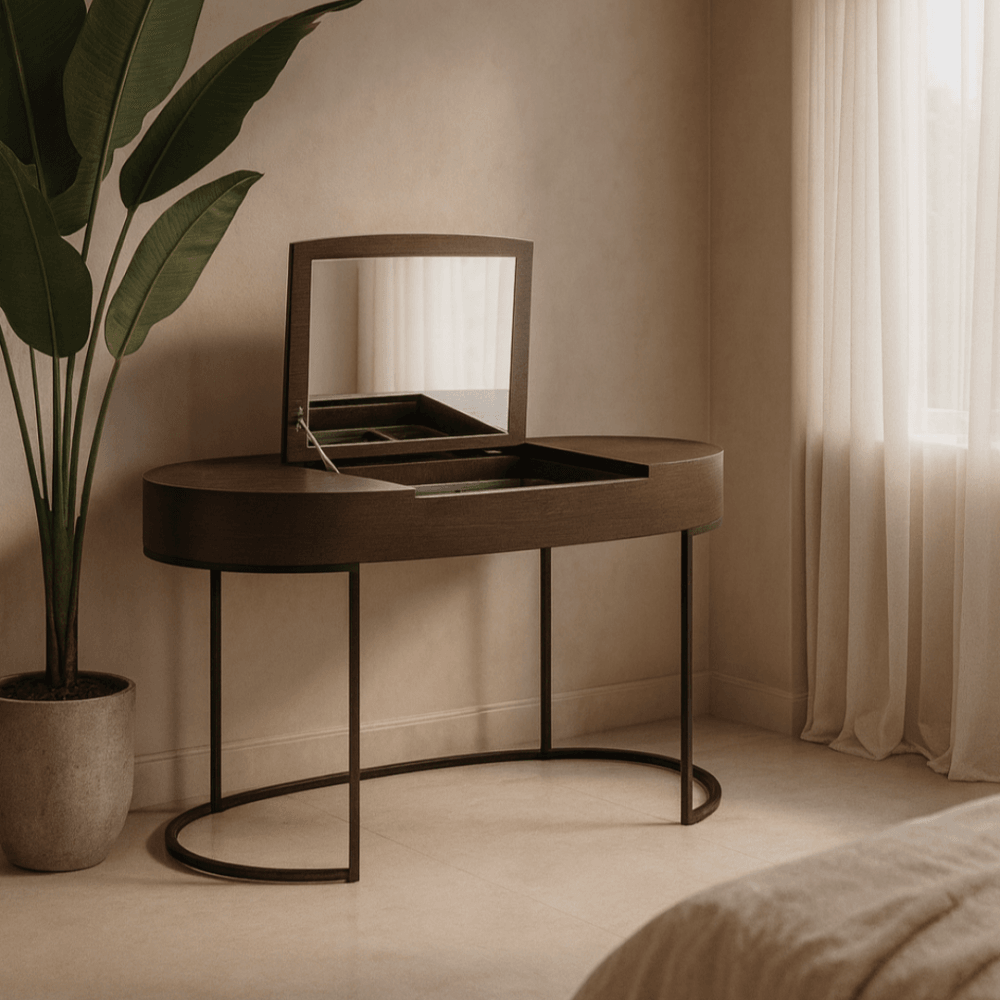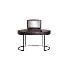The Verge Vanity epitomises sophistication and functionality, creating an exquisite centerpiece for any bedroom or dressing area. Its oval shape, adorned with a sleek grey wash veneer finish, exudes elegance and contemporary charm. Supported by black powder-coated legs, the vanity offers stability and a modern touch. The integrated pop-up mirror not only adds a touch of luxury but also provides convenience for flawless beauty routines. With ample storage space featuring different compartments, the Verge Vanity ensures efficient organization of cosmetics, jewelry, and grooming essentials. The unique base design enhances its artistic allure, making it a true statement piece that elevates the room's aesthetic appeal. Impeccably blending style and utility, the Verge Vanity offers an unparalleled experience for grooming and self-care, making it an indispensable addition to any living space.