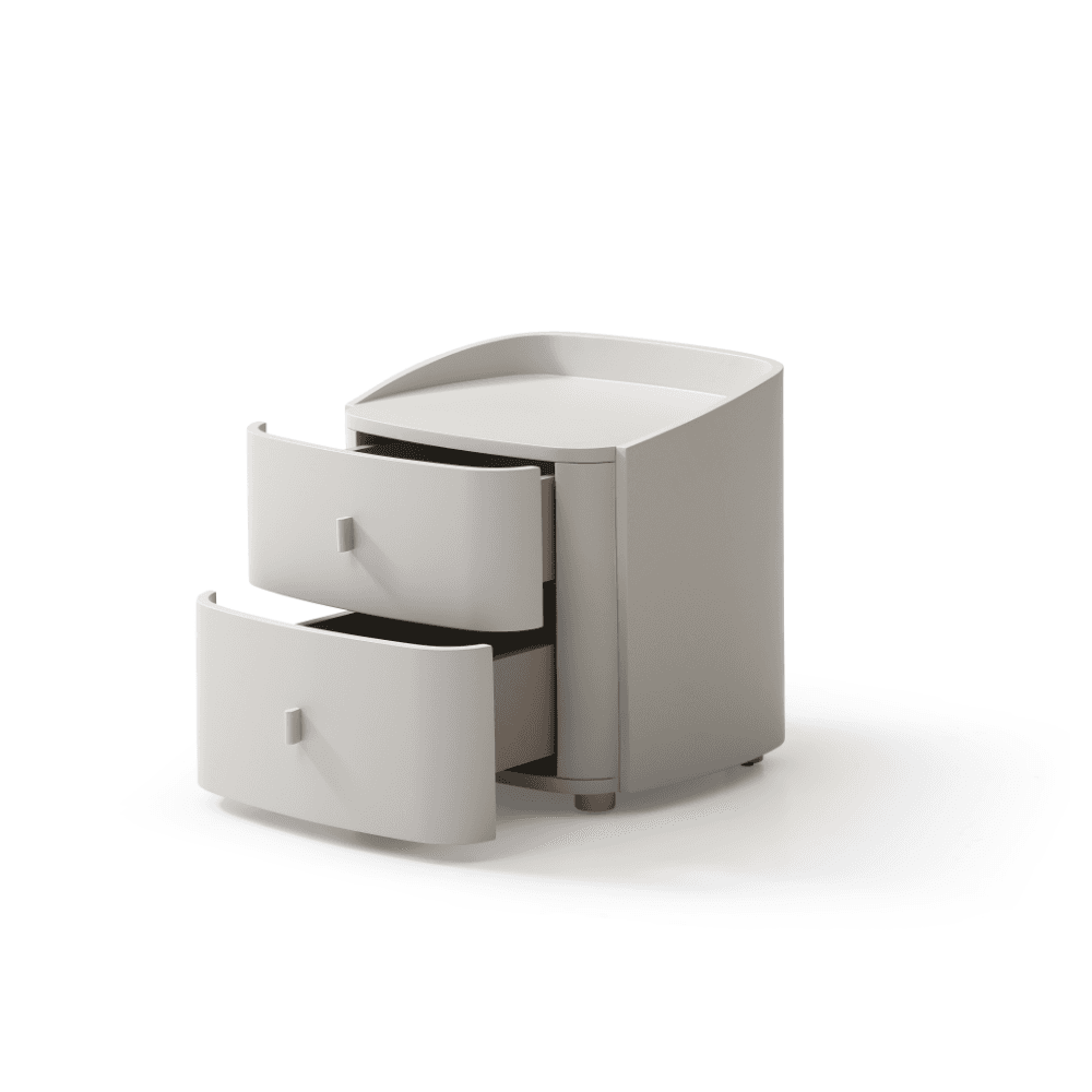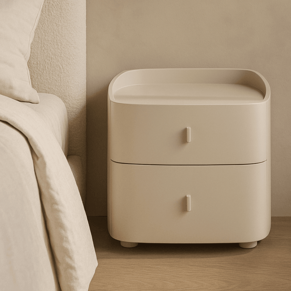 The Vertu Bedside Table is a chic, contemporary piece that effortlessly enhances any modern bedroom decor. Its sleek beige finish complements a variety of color schemes, adding a touch of understated elegance. The table's soft, rounded shape offers a gentle aesthetic that contrasts beautifully with its clean lines. Functionality is not compromised, as it features two generous drawers, providing ample storage space for bedside essentials. This blend of style and practicality makes the Vertu Bedside Table a perfect choice for those looking to infuse their space with both sophistication and convenience.
