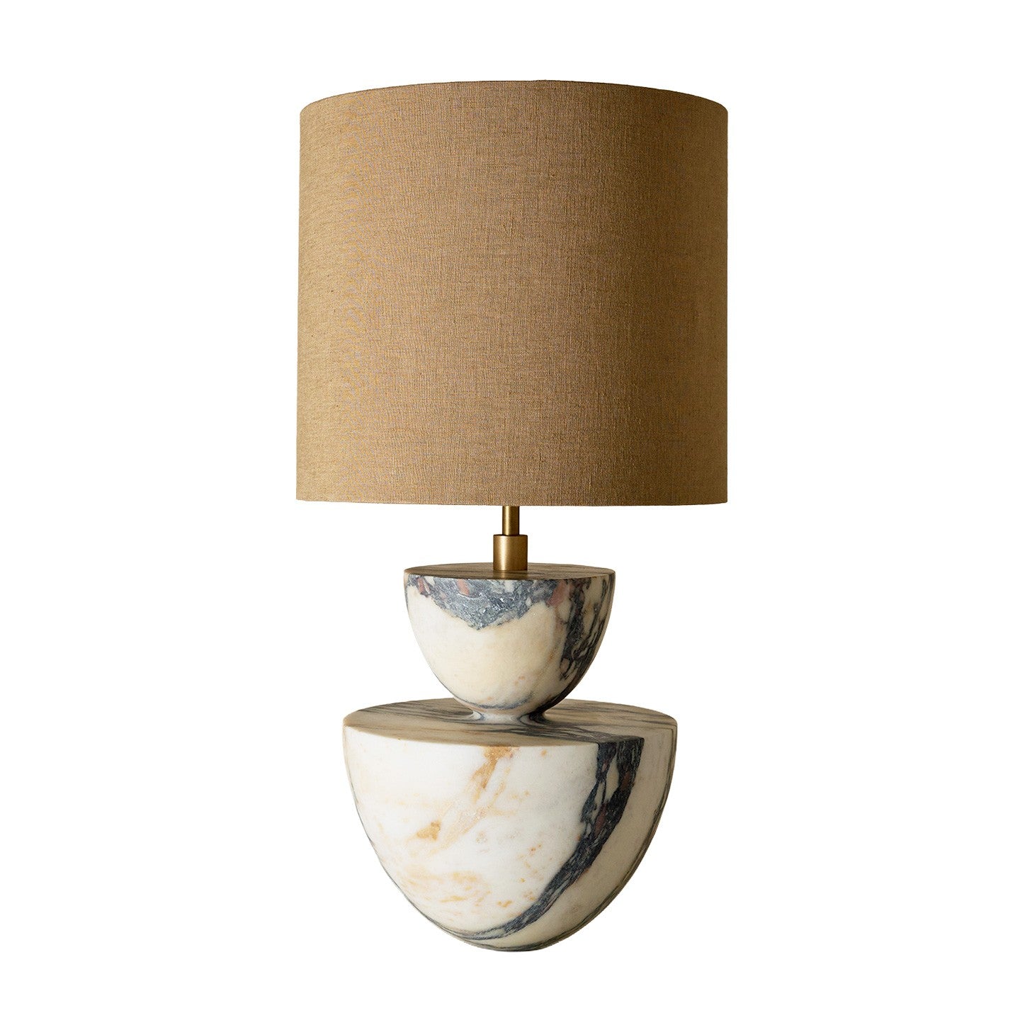 Anchored by a short, sculptural base carved from Calacatta Viola marble, Mabel features rich burgundy and brown veining unique to each piece. A soft fabric lampshade gently diffuses light, balancing the weight and permanence of natural stone with a warm, atmospheric glow. A grounded yet refined accent for bedside tables, consoles or living spaces.