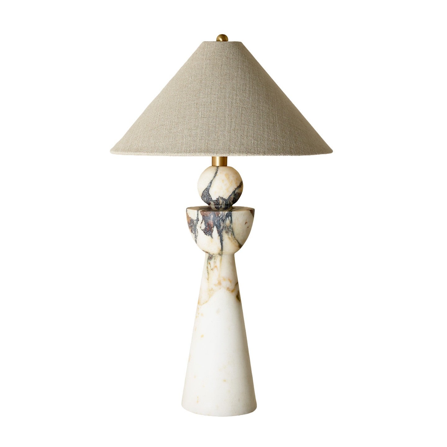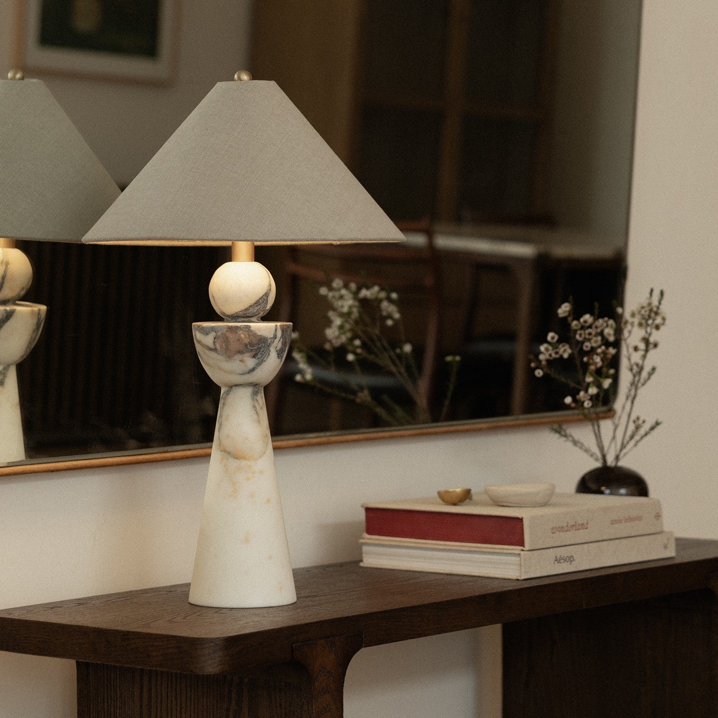 Featuring a stacked, pillar-shaped base crafted from Italian Calacatta Viola marble, Nova offers a more architectural interpretation of natural stone. Expressive veining adds depth and warmth, while the fabric lampshade softens the form, diffusing light evenly throughout a space. A striking yet versatile design that brings texture and material presence to any interior.