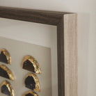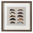 An exquisite wooden frame showcasing 10 naturally shaped agate pieces, each one carefully selected for its unique markings, colour variations, and organic charm. These polished agate slices are artfully mounted on a neutral linen canvas, allowing their natural patterns and earthy tones to take centre stage.