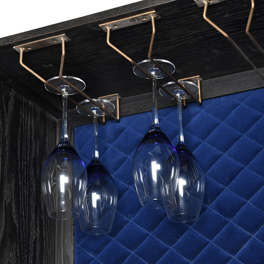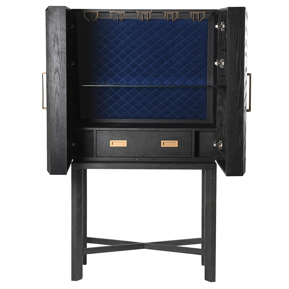 The Black 2 Door Bar Cabinet with Brass Handles is a striking statement piece that effortlessly blends luxury with functionality. Crafted from oak with a rich black finish, its sleek silhouette is complemented by elegant brass handles that add a refined contrast. Inside, the cabinet reveals a lavish surprise - a stitched blue velvet quilted interior that exudes sophistication and provides a soft, opulent backdrop for your glassware and bottles.