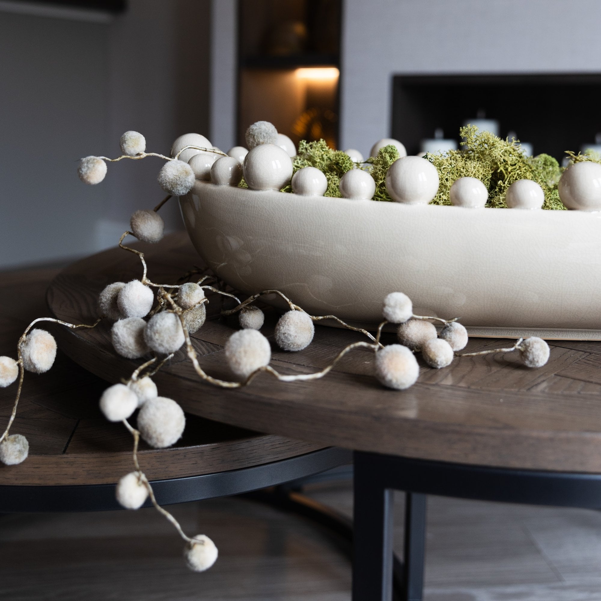 The Brown Pom Pom Willow Spray is a whimsical and eye-catching botanical element, featuring vibrant green foliage resembling soft pom poms. This decorative spray adds a touch of natural elegance to floral arrangements, bouquets, and home décor, making it a charming choice for those seeking a unique and playful botanical accent. These delicate pom pom's are a subtle way to add a soft touch of muted colour to your interior scheme.
