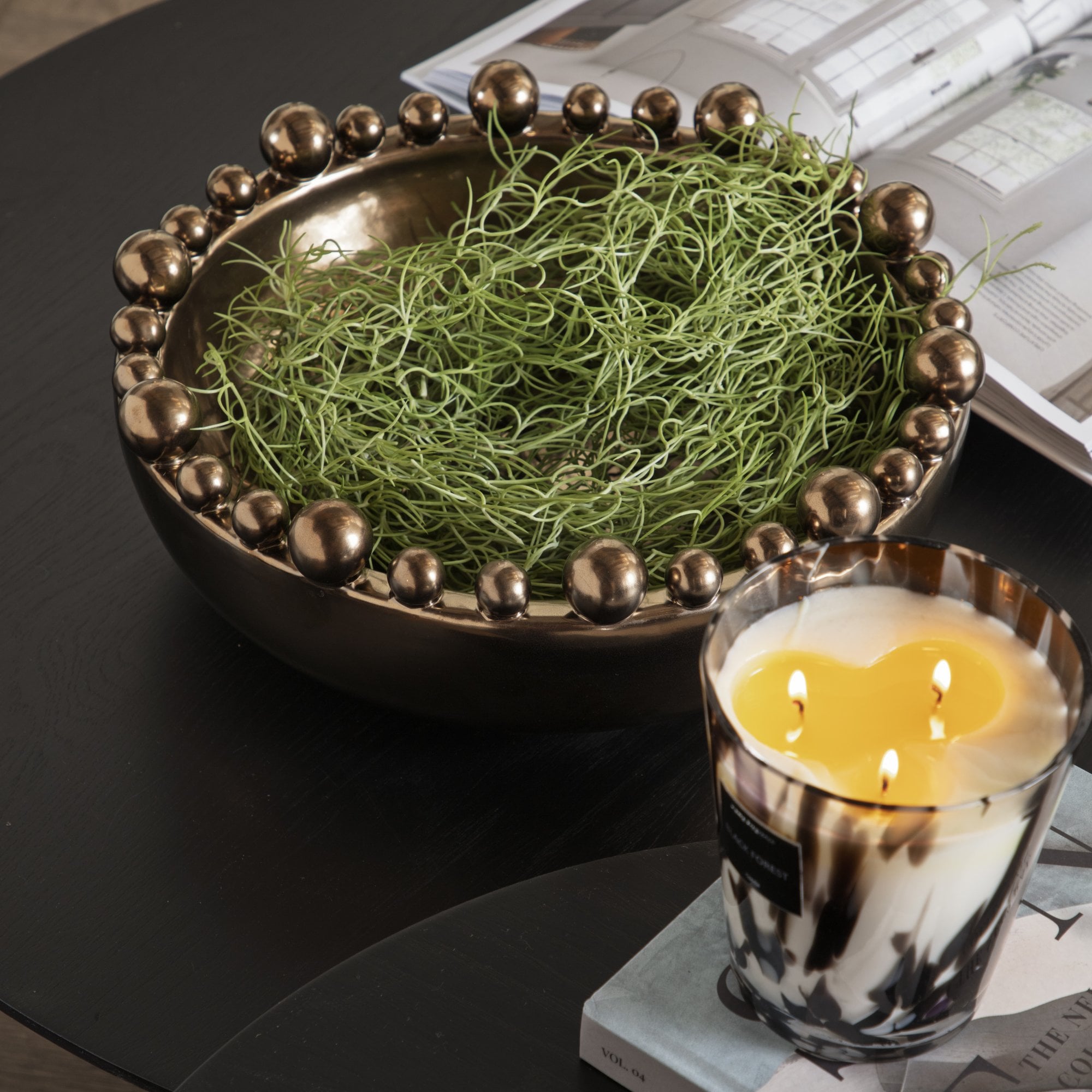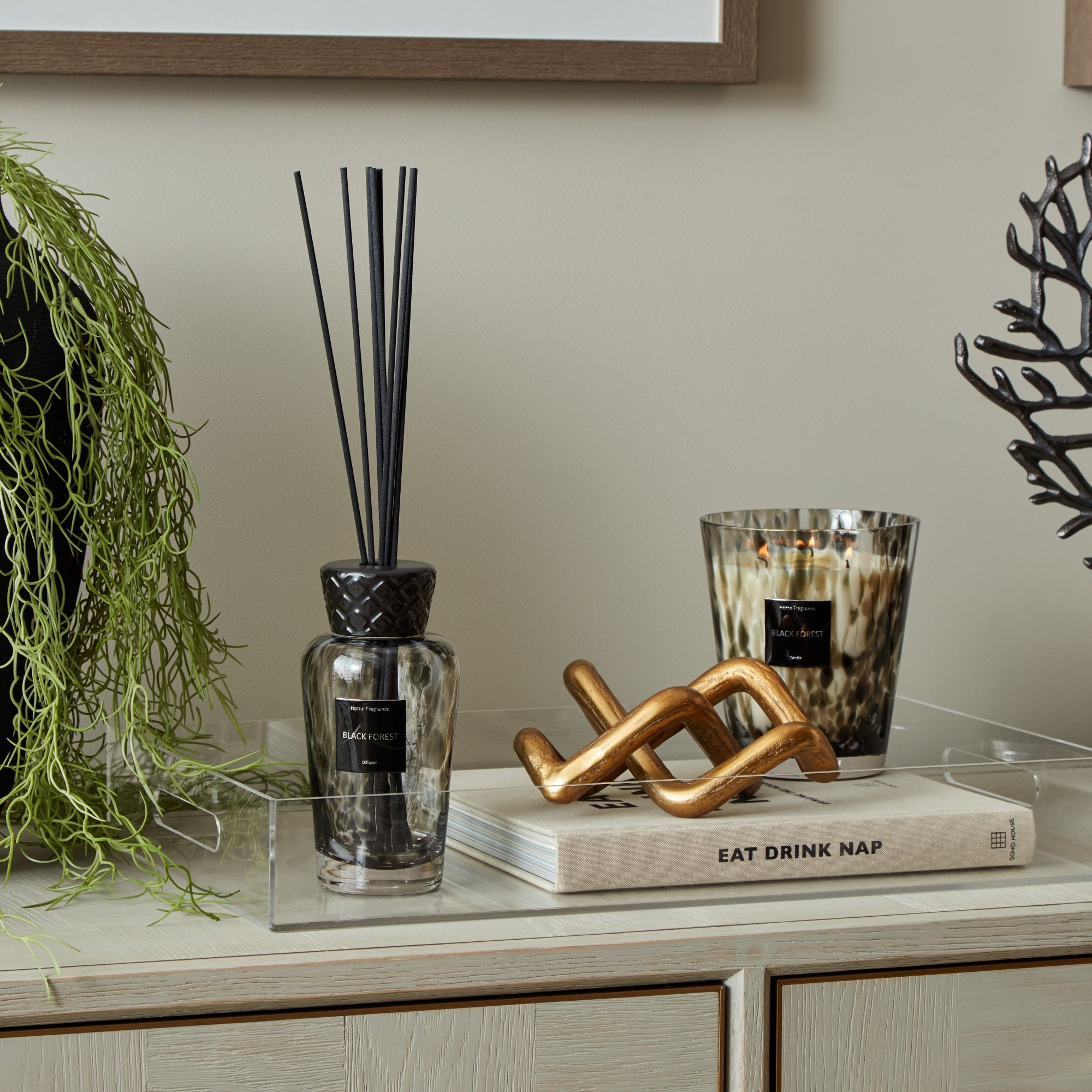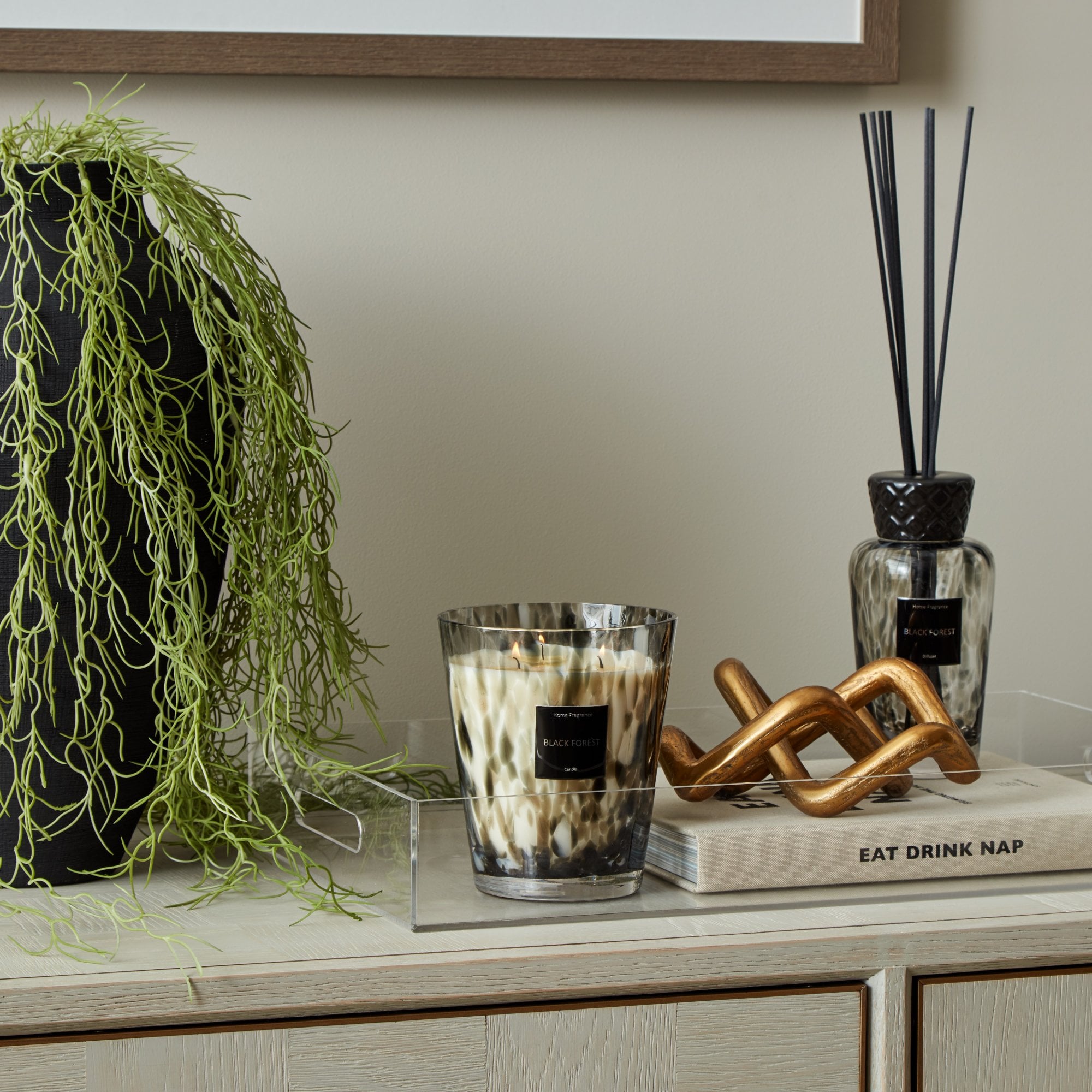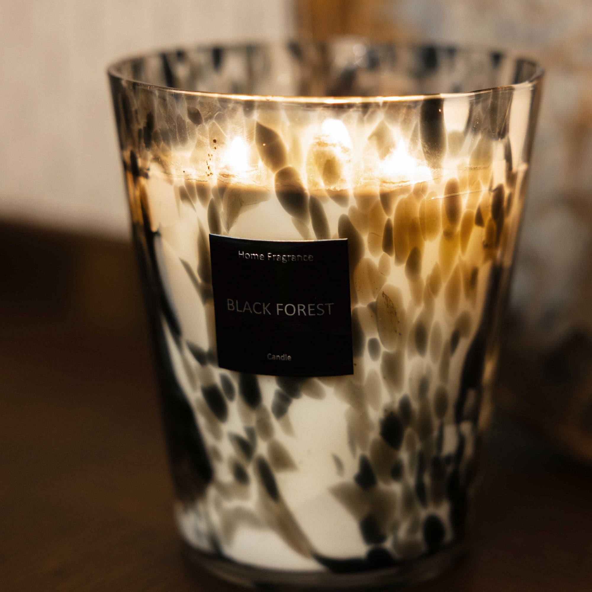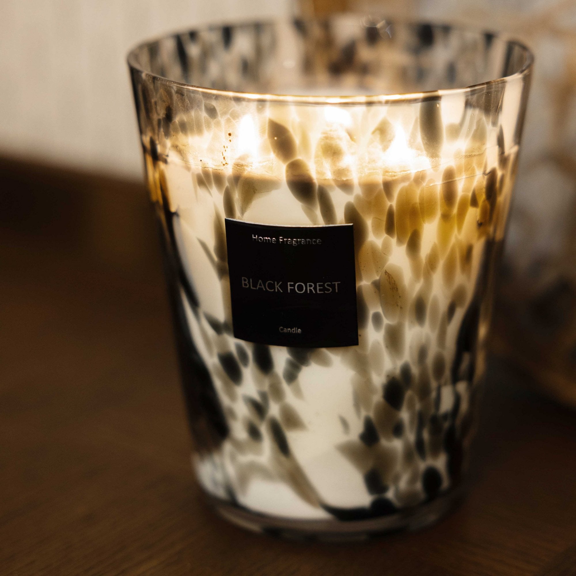 Large speckled luxe black forest candle in a gorgeous box with gloss highlights, perfect for styling your home or as an indulgent gift.