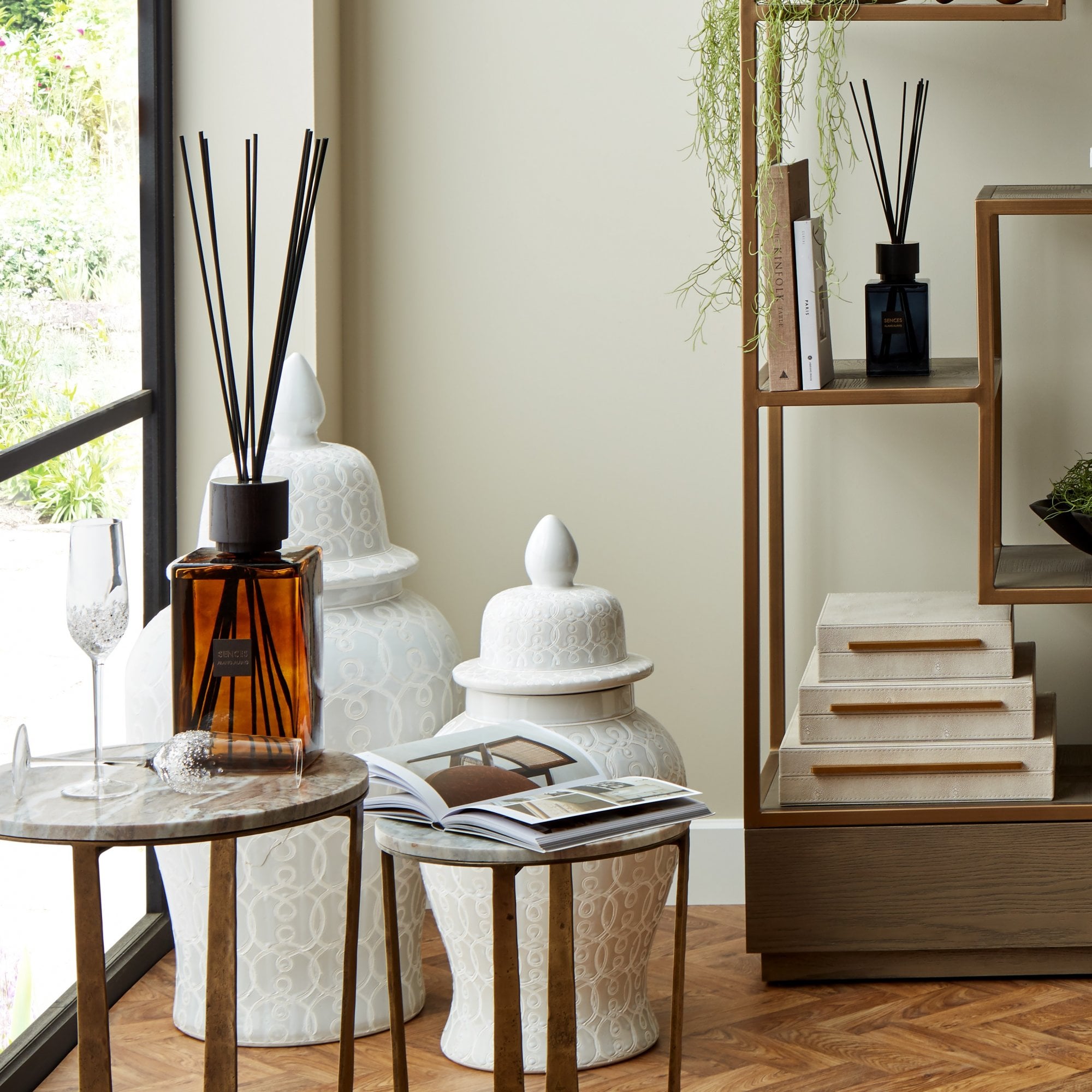 The best selling oversized reed diffuser from Decorum. Warm in both tone and fragrance. This Oversized Statement Moroccan Amber Reed Diffuser scent is an enchanting scent that combines the earthiness of amber with the warmth of spices, woods, and resins. With its warm and inviting aroma, it combines the rich, resinous notes of amber with hints of earthy spices and sweet, musky undertones. It creates a captivating olfactory experience, evoking images of desert landscapes, bustling marketplaces, and the alluring beauty of Morocco.