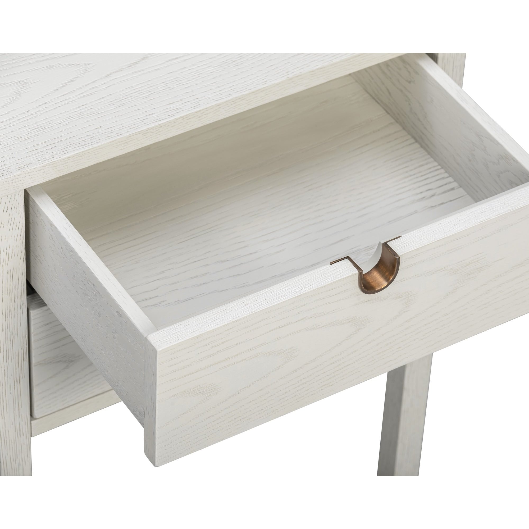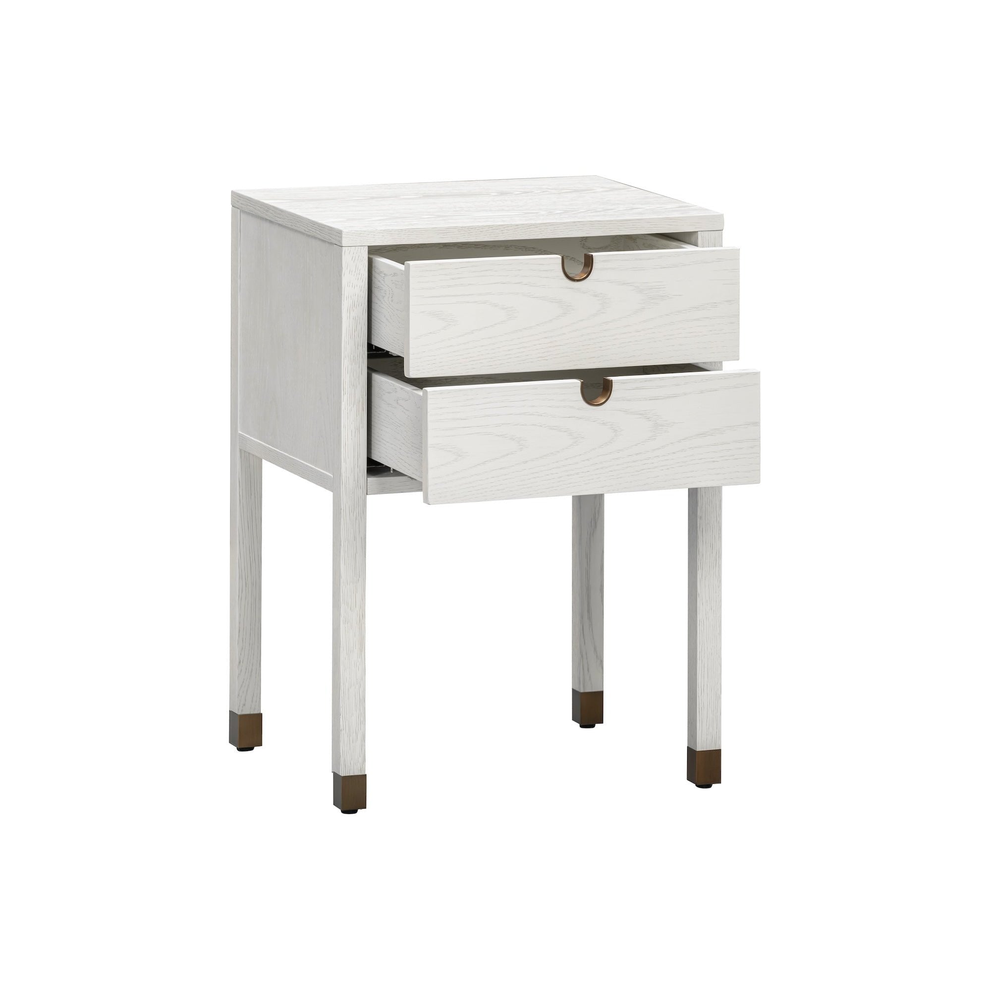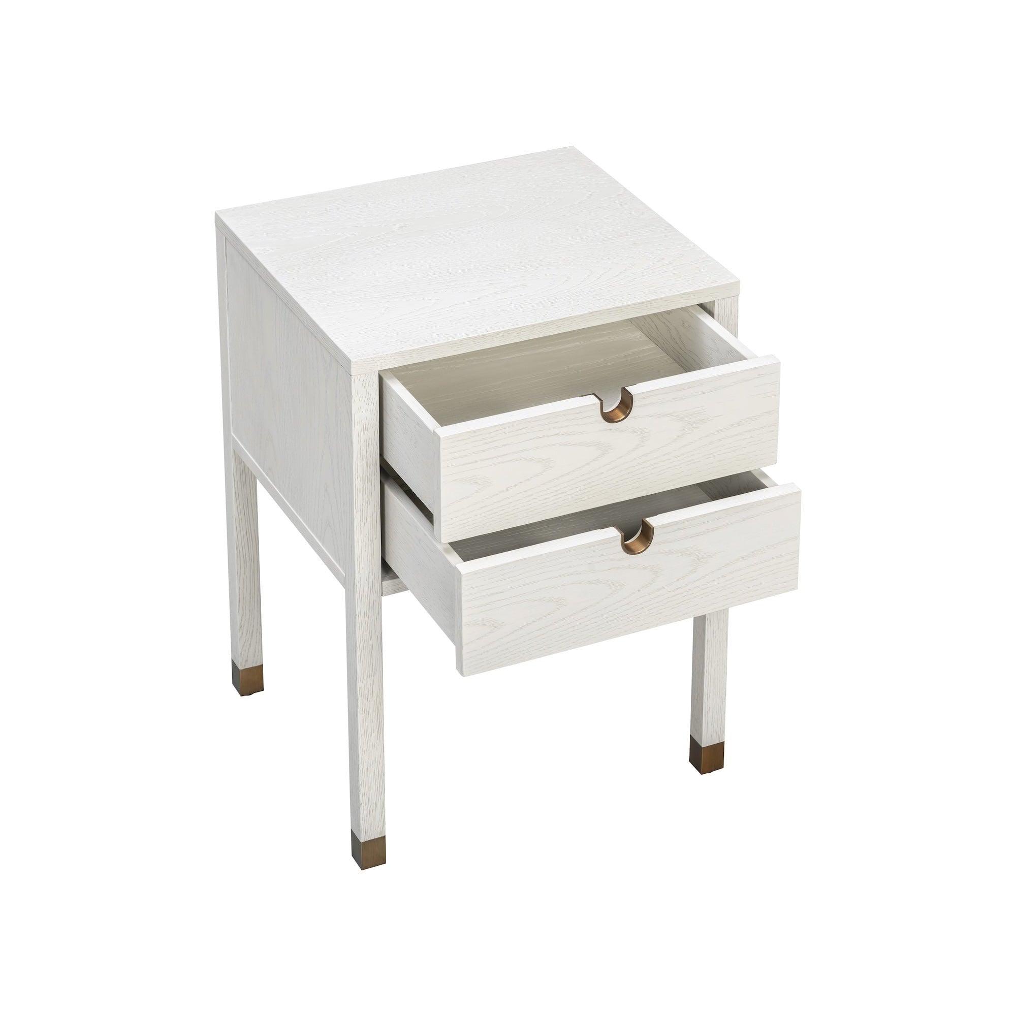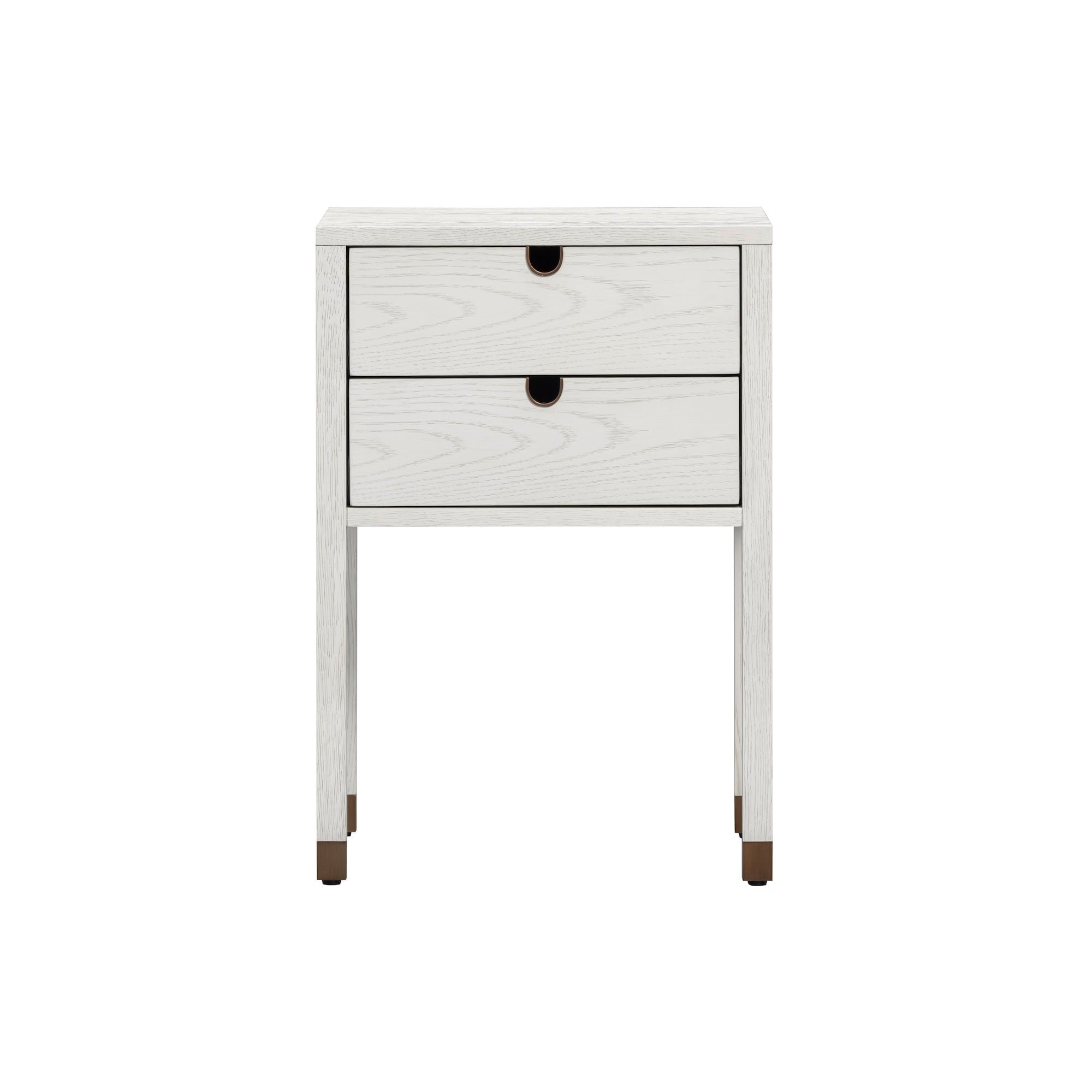 Two soft-close drawers with antique brass-lined cut-out pulls offer discreet storage, while solid oak legs capped with hand-finished antique brass feet lend a refined contrast. Functional yet artful, this design speaks to minimalist luxury with meticulous detail.