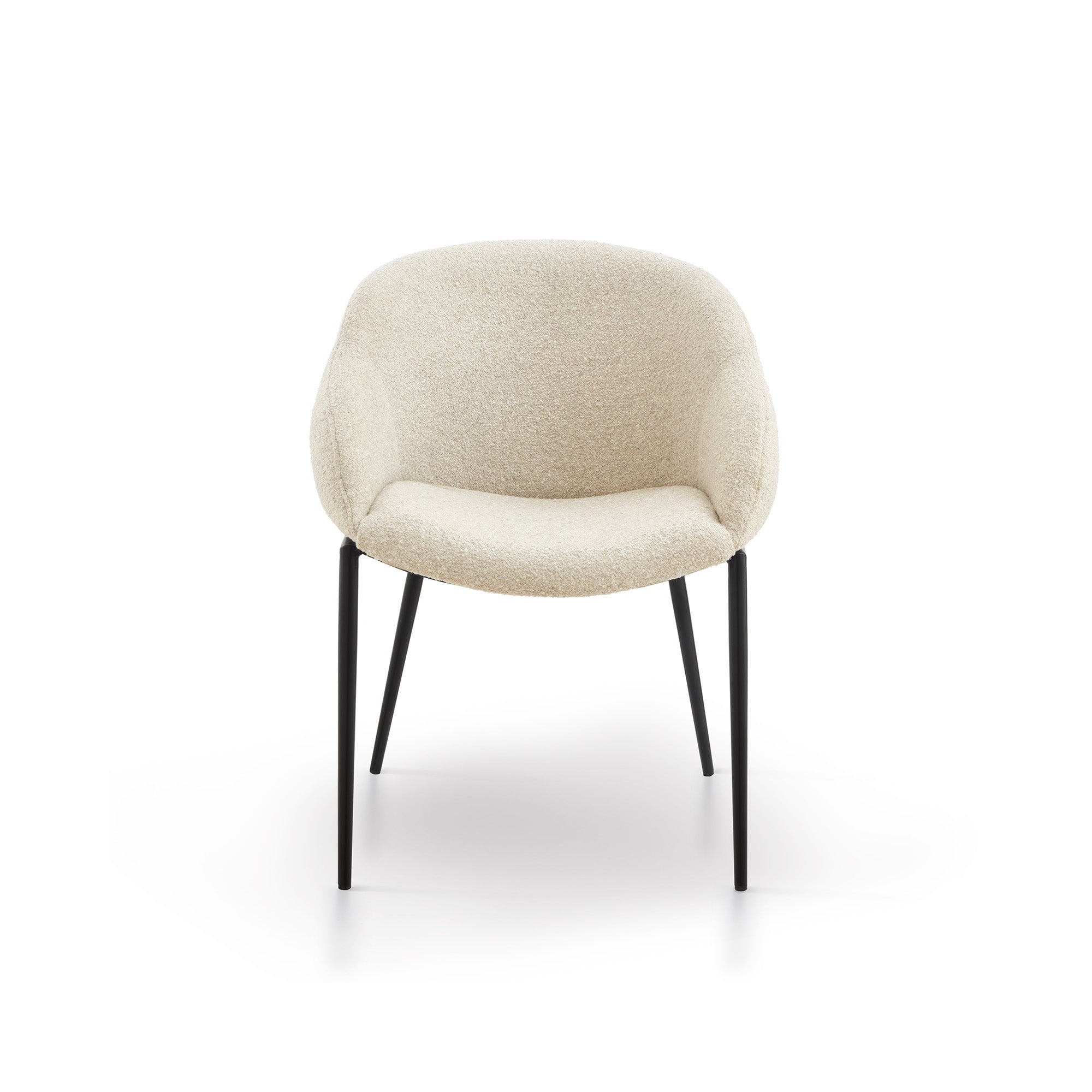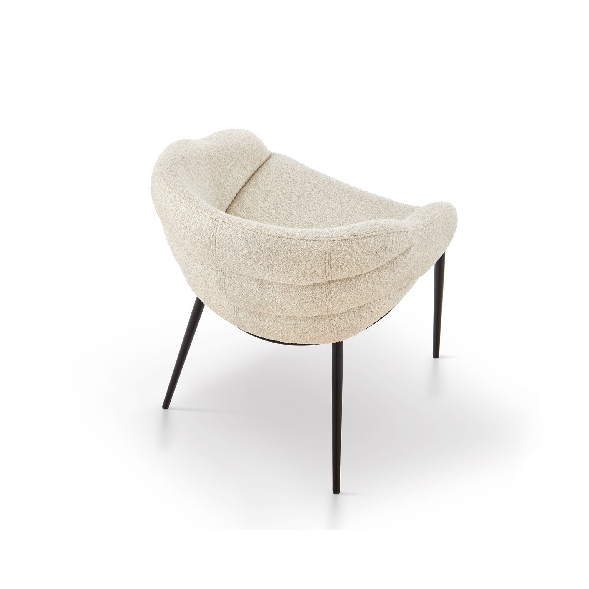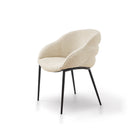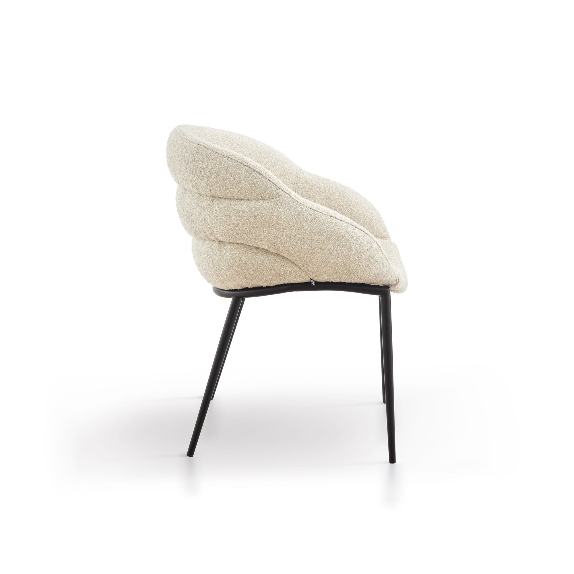 The Amber Dining Chair exudes elegance and comfort with its Colman Pearl boucle fabric and sleek matt black steel legs. The soft, textured fabric offers a unique tactile experience, while subtle channel stitching on the back elevates its sophisticated appeal, perfect for any dining occasion.