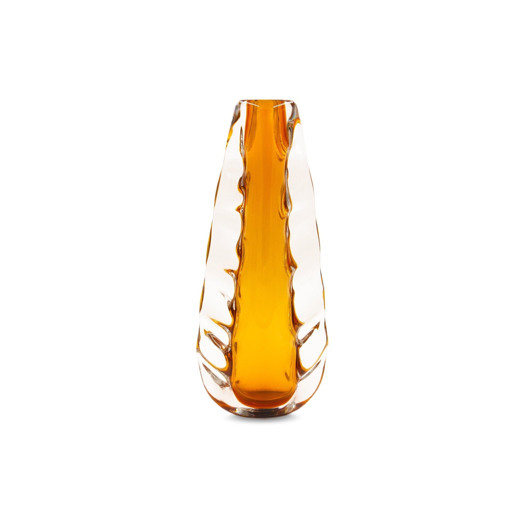 The Astell Crystal Vase, with its organic leaf-like design, serves as a striking centrepiece. Its amber hue captivates on its own or when grouped with smaller vases of the same style, enhancing any space with a glamorous, nature-inspired aesthetic.