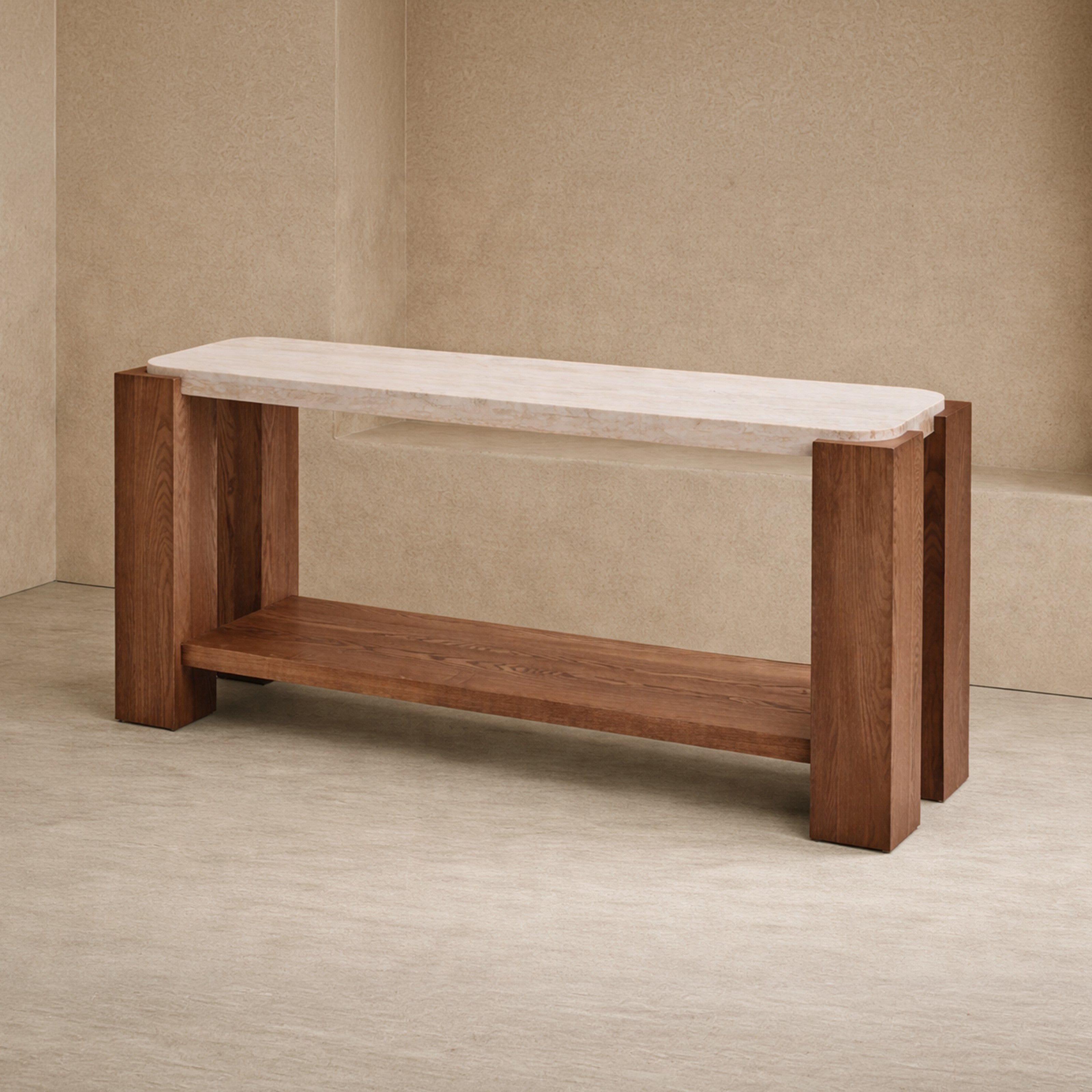 Calla Console Table is defined by contrast - a softly honed Beige stone top resting within a bold Mid Brown timber framework. The rounded edges of the surface temper the strength of its architectural legs, creating a balance between solidity and refinement. Designed to elevate hallways, living spaces or hospitality settings, Calla brings depth, texture and quiet drama through its interplay of natural materials and considered proportion.