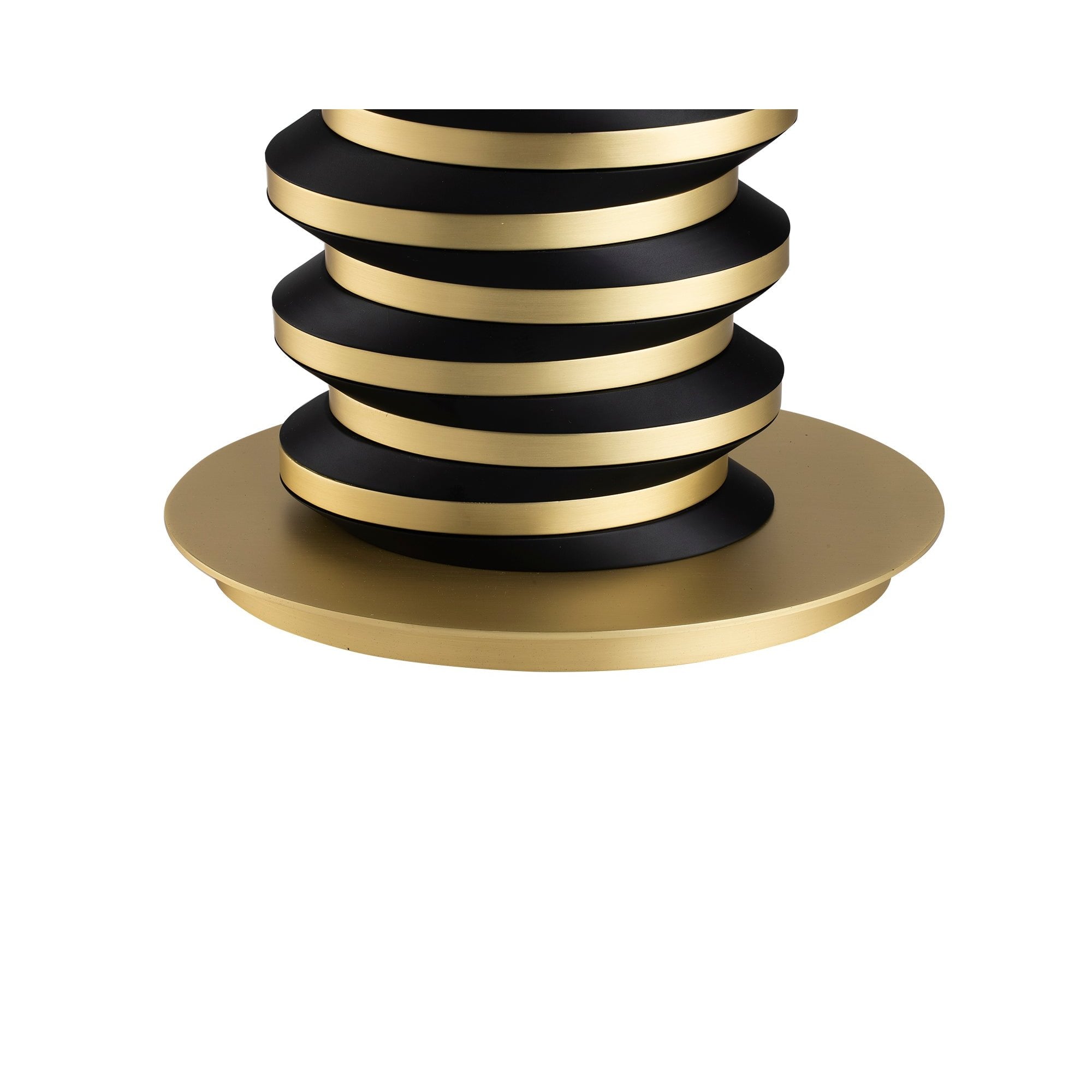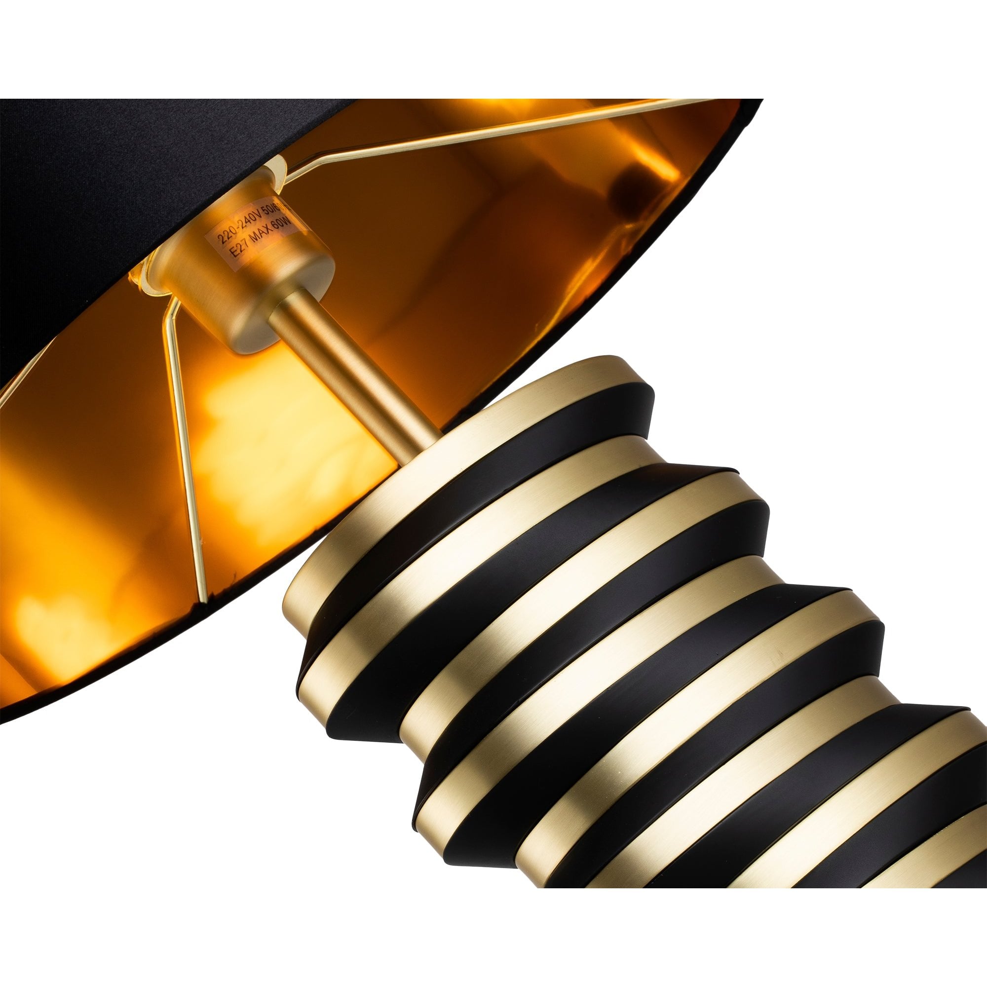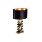 Elevate your living or hospitality space with the Jacquard Table Lamp, featuring a stunning brushed brass finish elegantly contrasting with matte black accents. The unique, intricate body showcases rounded stacked discs that create a captivating visual statement, while the black fabric shade with its luxurious gold interior adds a sophisticated glow. Ideal for creating an inviting atmosphere, it requires 1 x E27 MAX 60W bulb (not included) and is compatible with dimmable bulbs and switches.