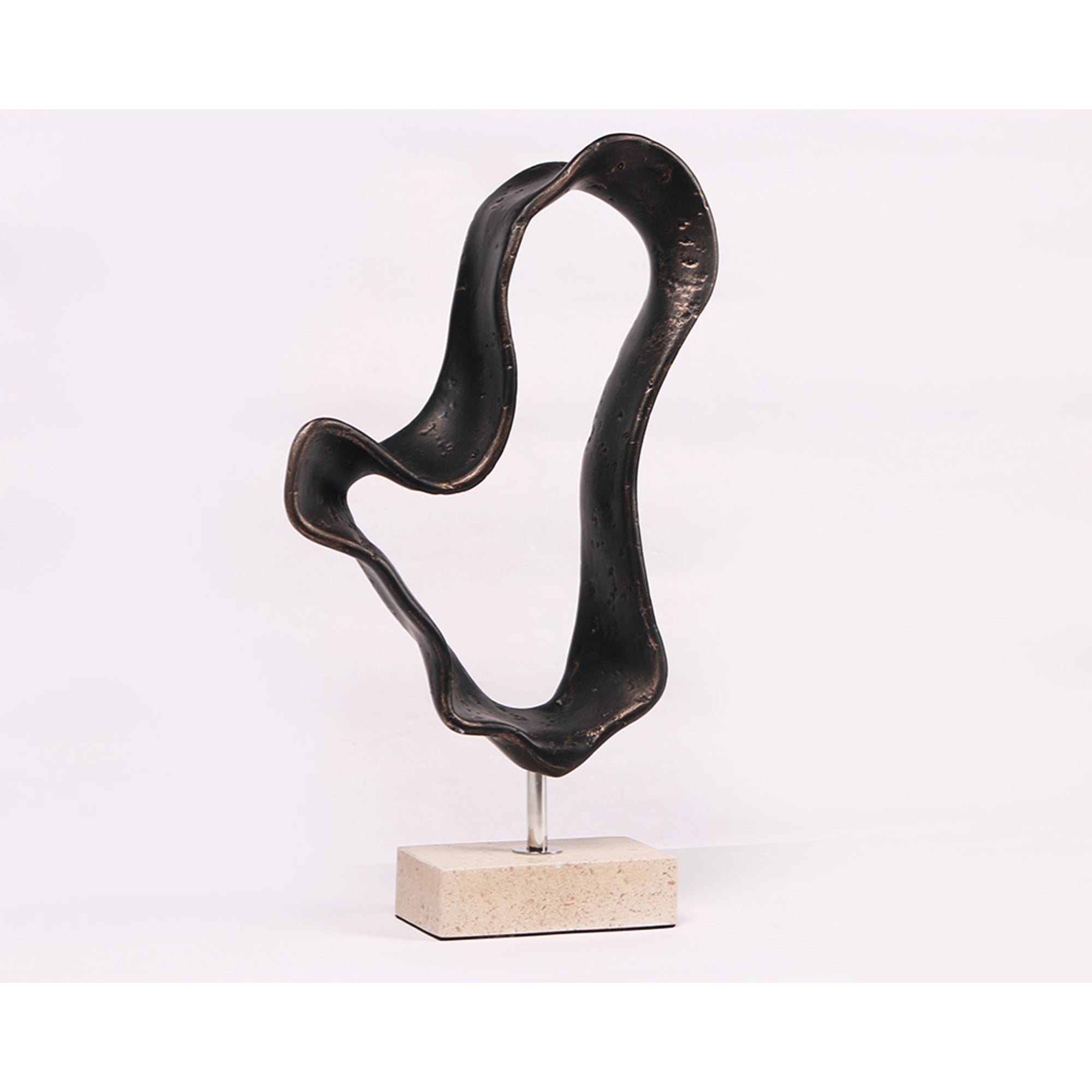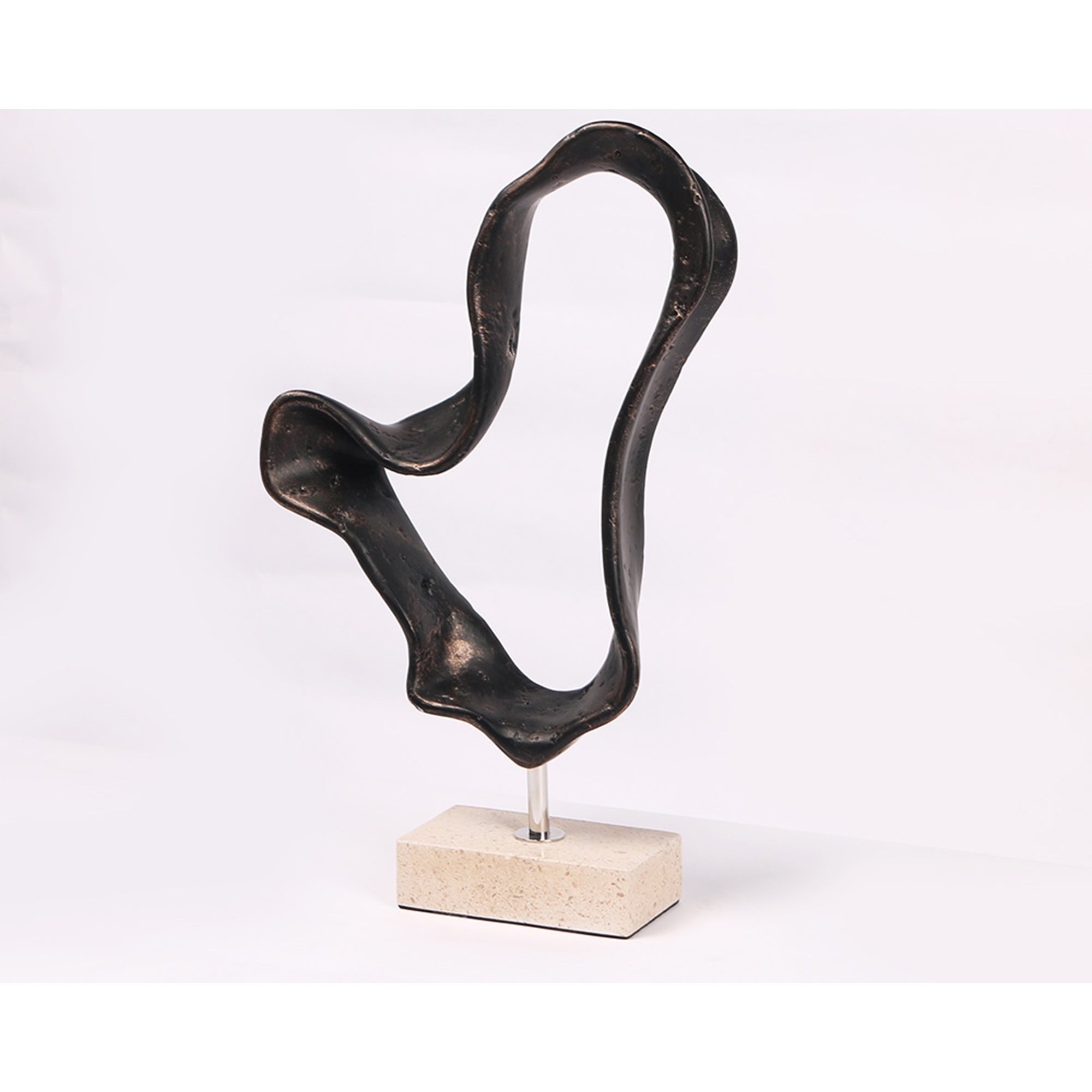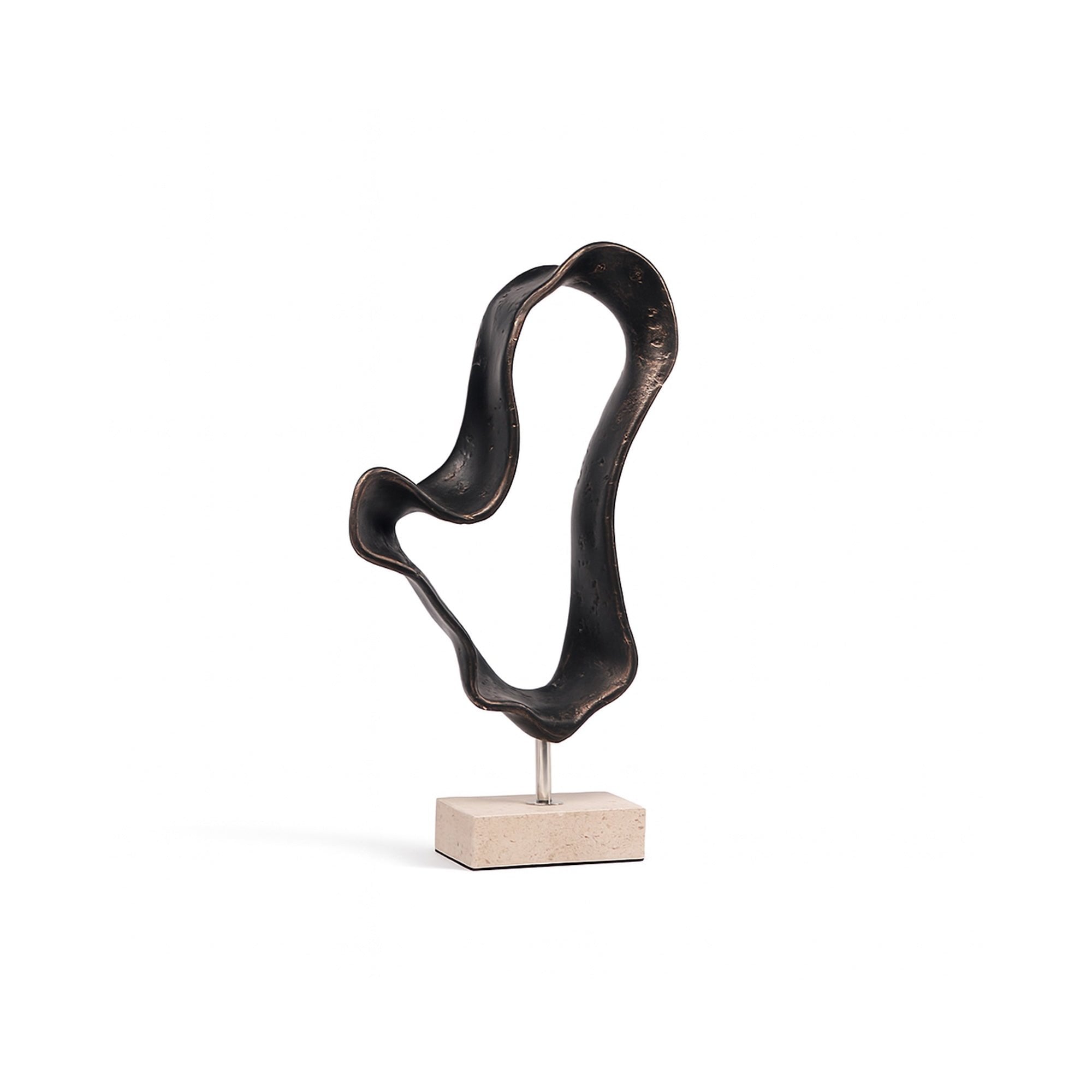 Sleek and contemporary, the Ondra Sculpture is a visual rhythm of intersecting lines and curves. Ideal for modern spaces. Made with Dark Bronze Resin and Cream Marble.