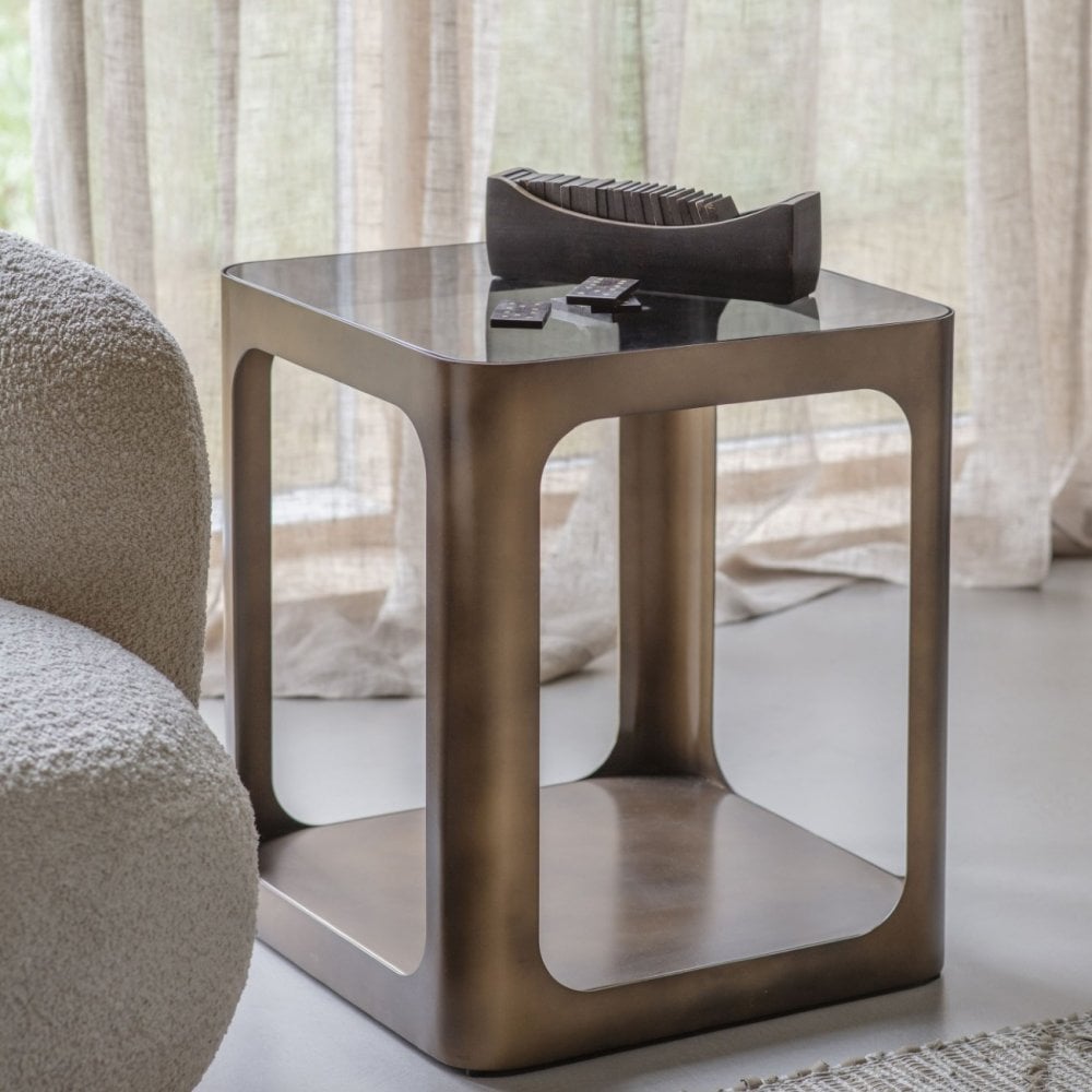 The Thorpe Console Table seamlessly blends modern design with luxurious finishes. Its dark smoked gold finish exudes sophistication, complemented by a sleek black-tinted tempered glass top. With clean, geometric lines and balanced symmetry, this console table elevates any space with its simple silhouette and sumptuous smoky texture, embodying timeless refinement and contemporary allure. This collection also includes a shelving unit, coffee table, side table, console table, and hurricanes.