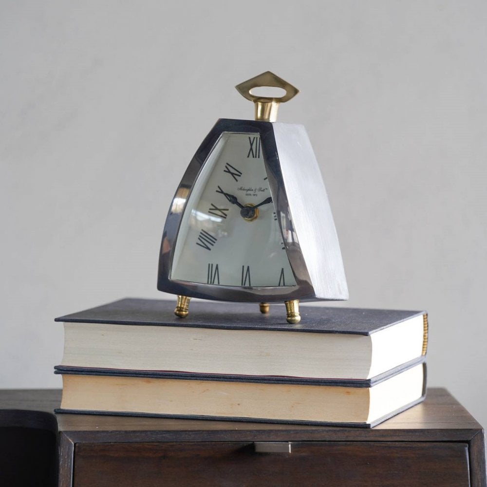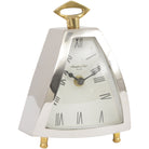 Featuring a curved front, an elegant triangular shape and delicate brass fittings, this stunning mantel clock will look beautiful on a desk or shelf. Roman numerals decorate the face, offering a classic touch that sets this luxury clock apart.