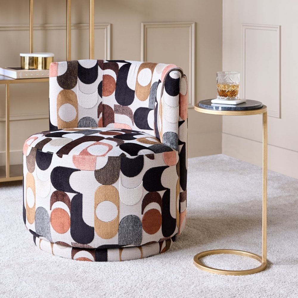 Expressive and compact, the Portico Swivel Chair brings sculptural style and playful geometry to modern interiors. Upholstered in an exclusive, trendy Belgian slub velvet, its retro-inspired pattern mixes warm neutrals with ochre, blush, and espresso tones for a rich ‘of the moment’ style. The low curved back and generously cushioned seat offer superb comfort, while the hidden swivel base allows for effortless movement. Whether styled as a pair or standing solo, Portico is a bold accent piece with standout personality and refined craftsmanship. 63.5 x 63 x 68.5cm. Seat Height 43cm