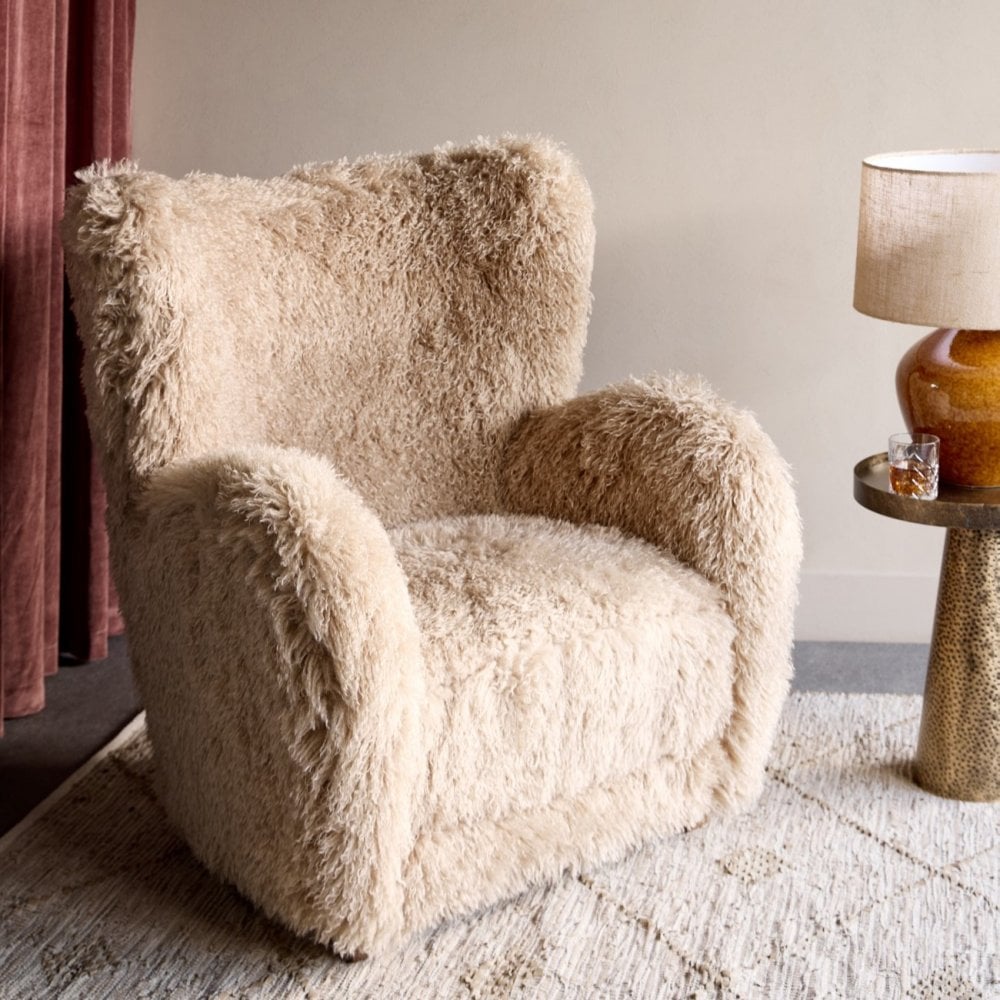A celebration of playful texture and enveloping comfort, the Wallace Faux Sheepskin Chair makes a bold yet inviting statement. Generously proportioned and fully upholstered in sumptuous, shaggy faux sheepskin, its silhouette adds warmth and whimsy to any setting. The deep seat and softly curved backrest offer a cocooning feel, while the plush upholstery brings irresistible tactility. Ideal for creating a cosy reading nook or anchoring a relaxed lounge scheme, Wallace is both indulgent and impactful. A smaller swivel version is also available in the Wallace range, perfect for compact spaces or pairing as a set. 86x93x102cm