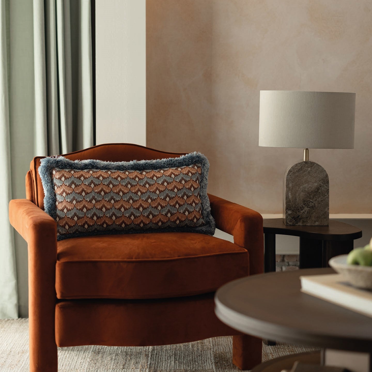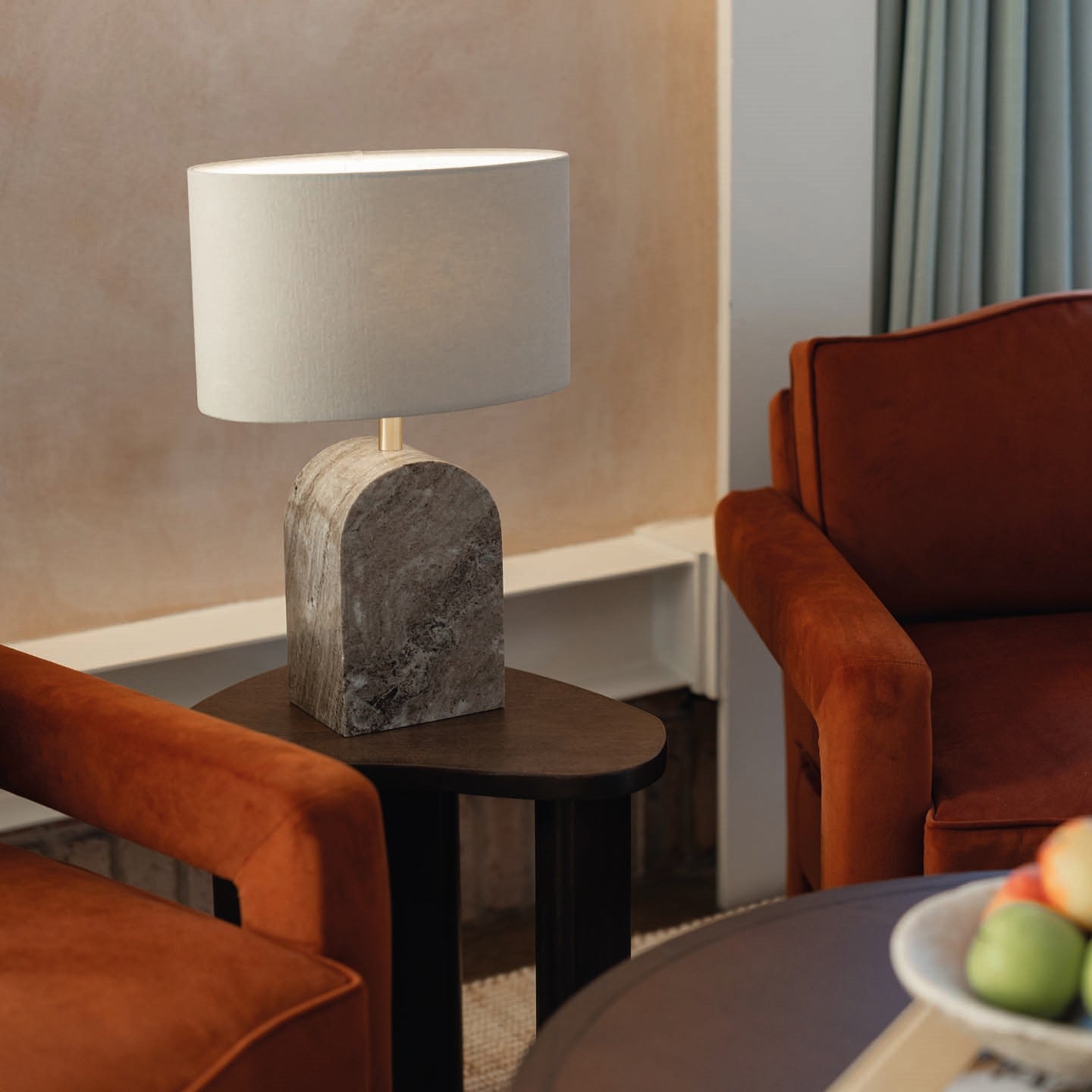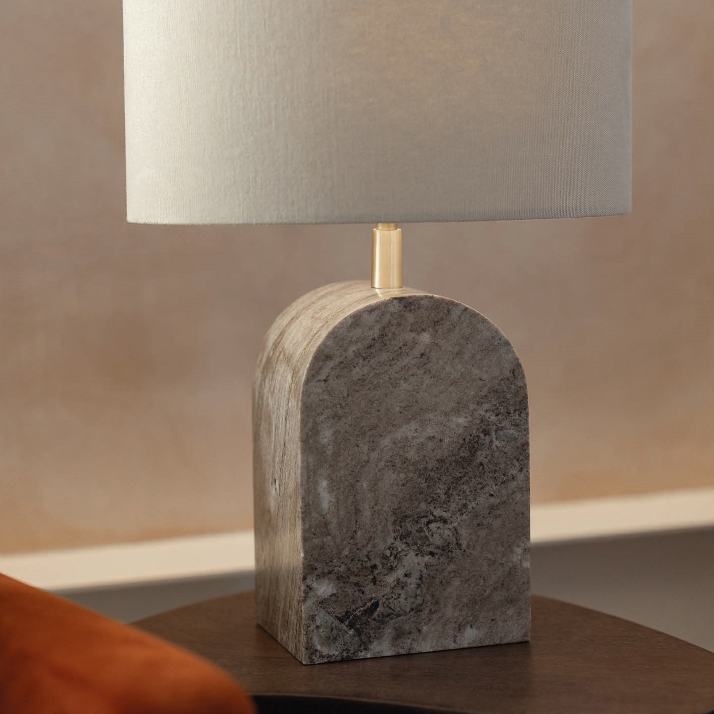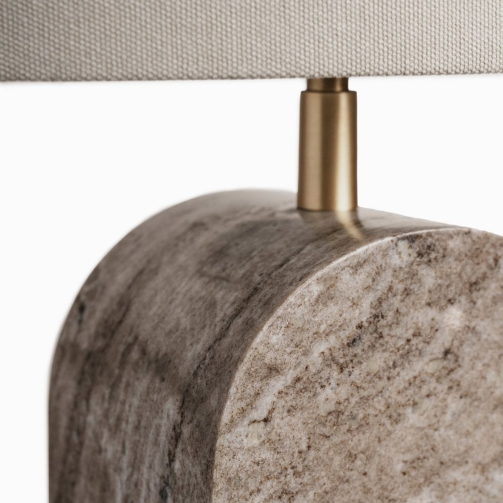 Crafted from solid Italian Crema Marfil marble, which has natural colour variations and inclusions, the Anais lamp is truly one of a kind. Its gentle arched form mirrors the organic lines found in nature, while the cream tones of the marble bring warmth to any interior. It is finished with subtle Satin Brass detailing and comes with a natural linen, oval lampshade to complement the design.