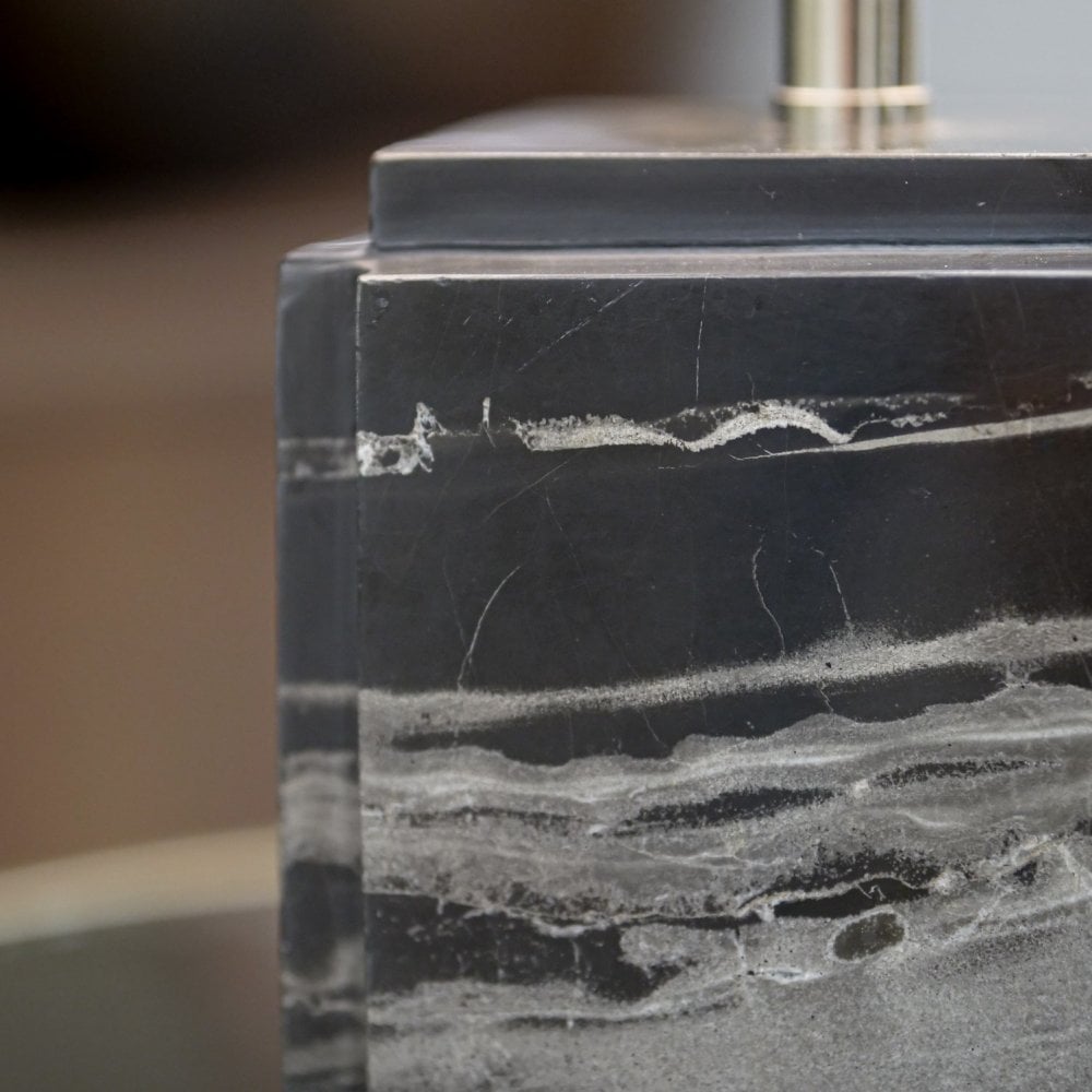 Marble-finished cube base and drum shaped charcoal shade. Chrome Accents Sleek & Contemporary in design. Ideal for any room in the home.