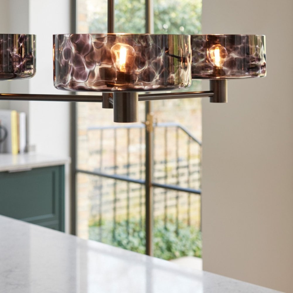 Beni is designed to be seen. Perfect for placing over an island or anywhere with a slightly lowered ceiling due to its shorter drop, this flush pendant features 3 glass shades with confetti like detailing.