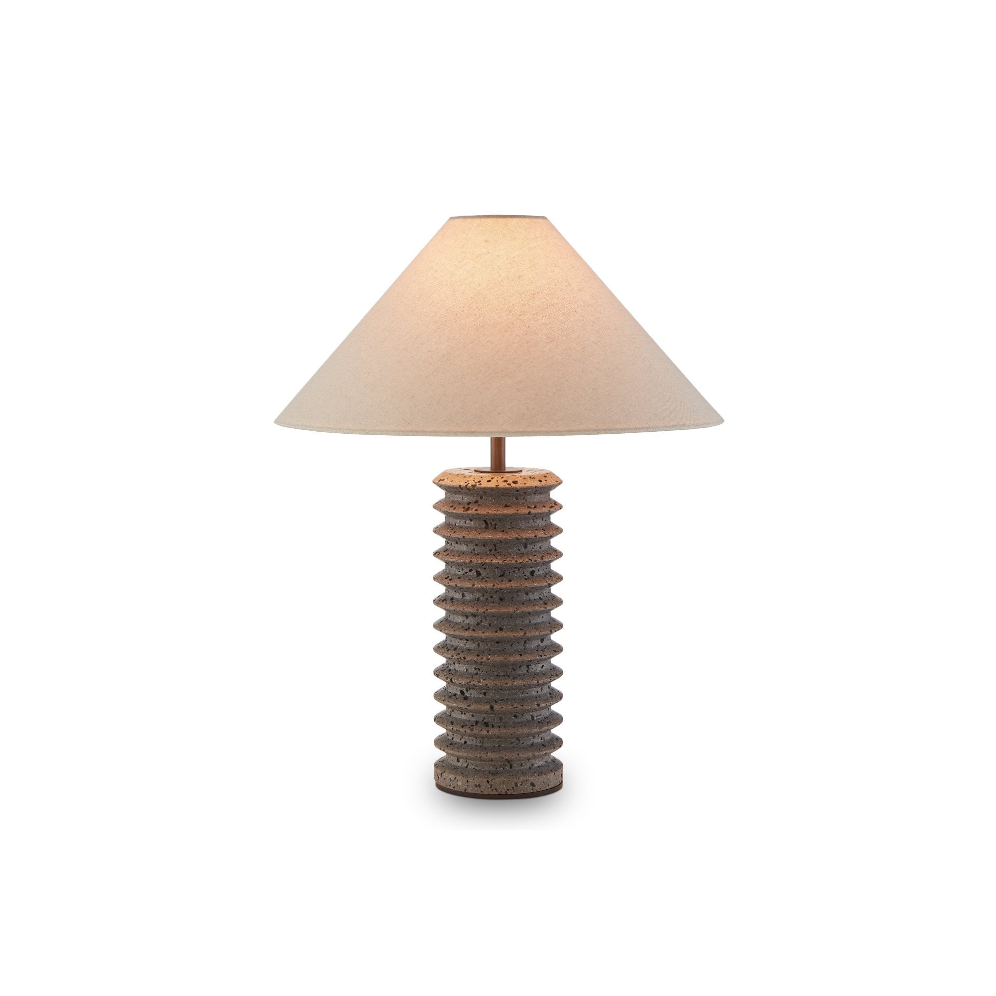 Defined by texture and sculptural rhythm, the Carson Table Lamp showcases a striking tiered silhouette that brings depth and architectural interest to the space. The dark travertine surface introduces a rich, tactile character, contrasted by warm antique bronze detailing and softened by the gentle diffusion of the grey linen shade, creating a calm, atmospheric glow suited to both refined residential interiors and sophisticated hospitality settings.