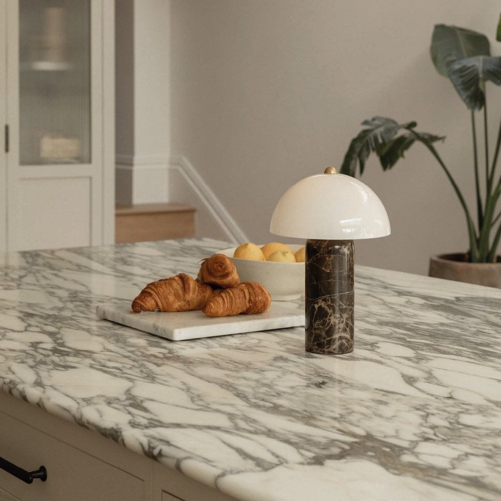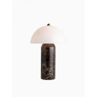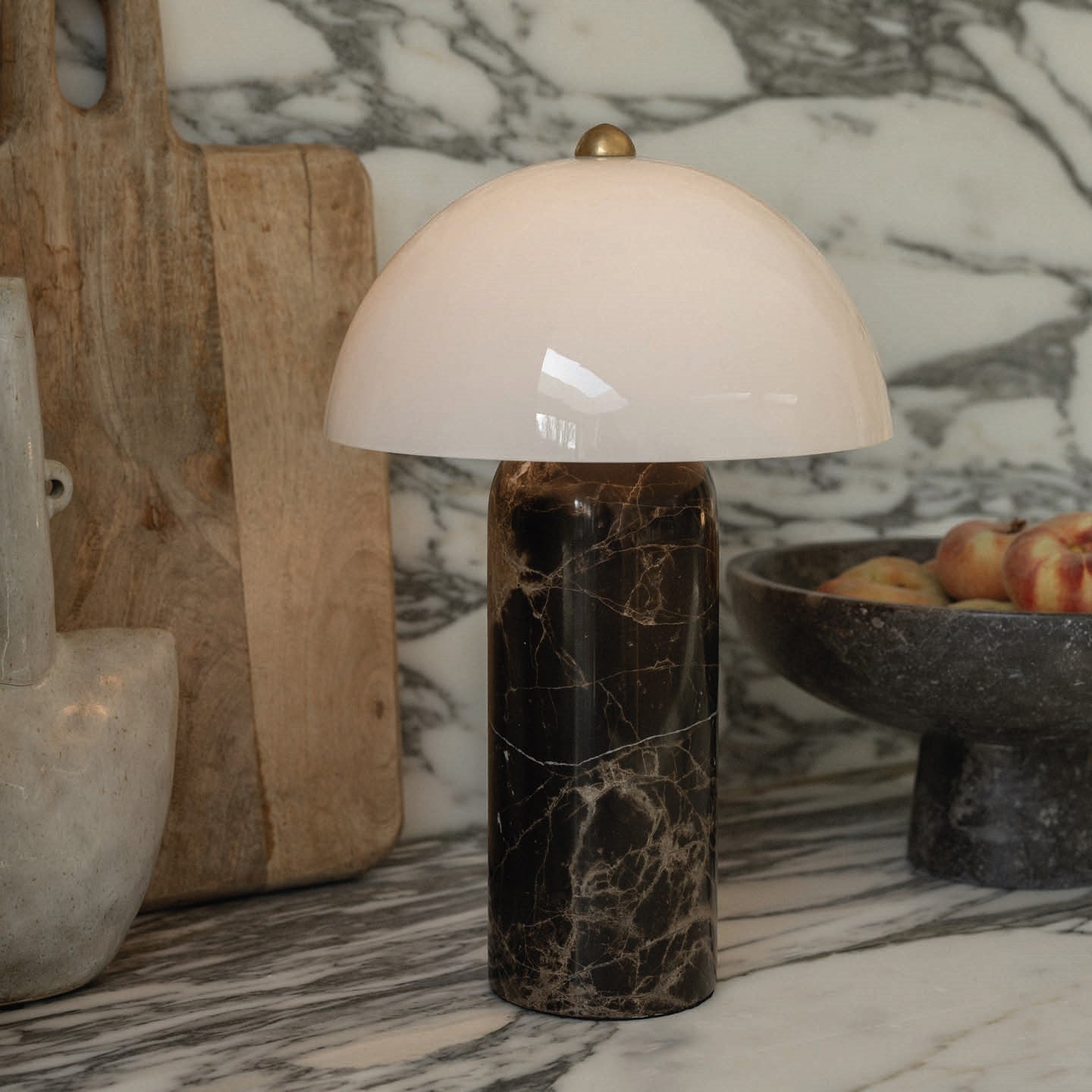 The Circe portable lamp, created in collaboration with Pollyanna Wilkinson, brings contemporary elegance to indoor and outdoor living spaces. Featuring a rounded Emperador marble pillar base, which is paired with a semicircular Opal white glass shade for a soft, atmospheric glow. The Waxed Brass finial conceals a 3-touch brightness switch, ensuring Circe is as adaptable as it is timeless. IP44 rated for outdoor use.