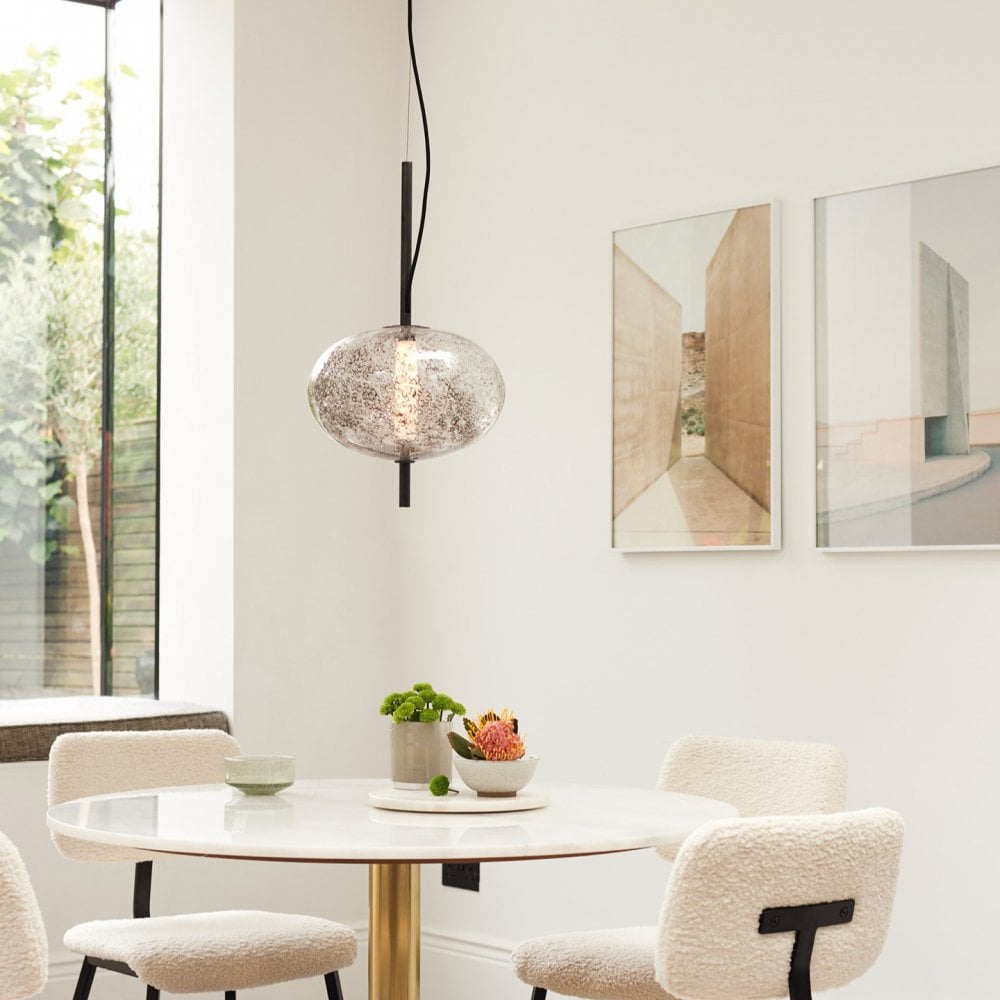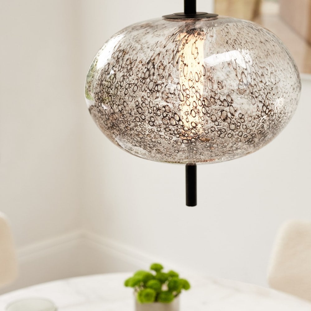 The Coda pendant's singular glass shade features a unique 'mottled' finish that has been achieved through a meticulous process of adding bubbles with a soda and metal grains, resulting in a warm and inviting bronzy depth.