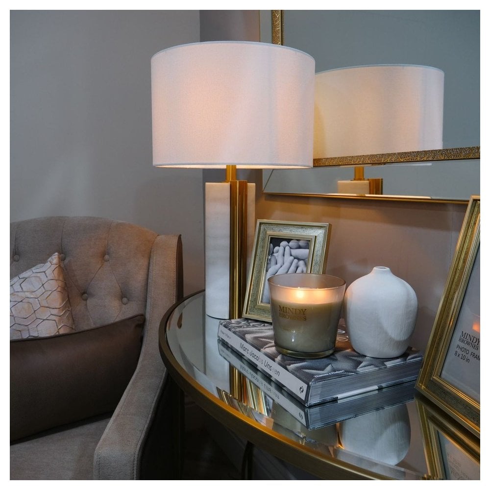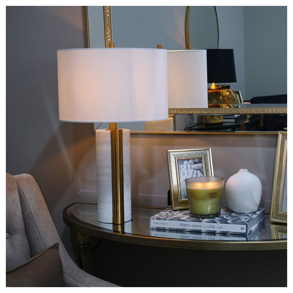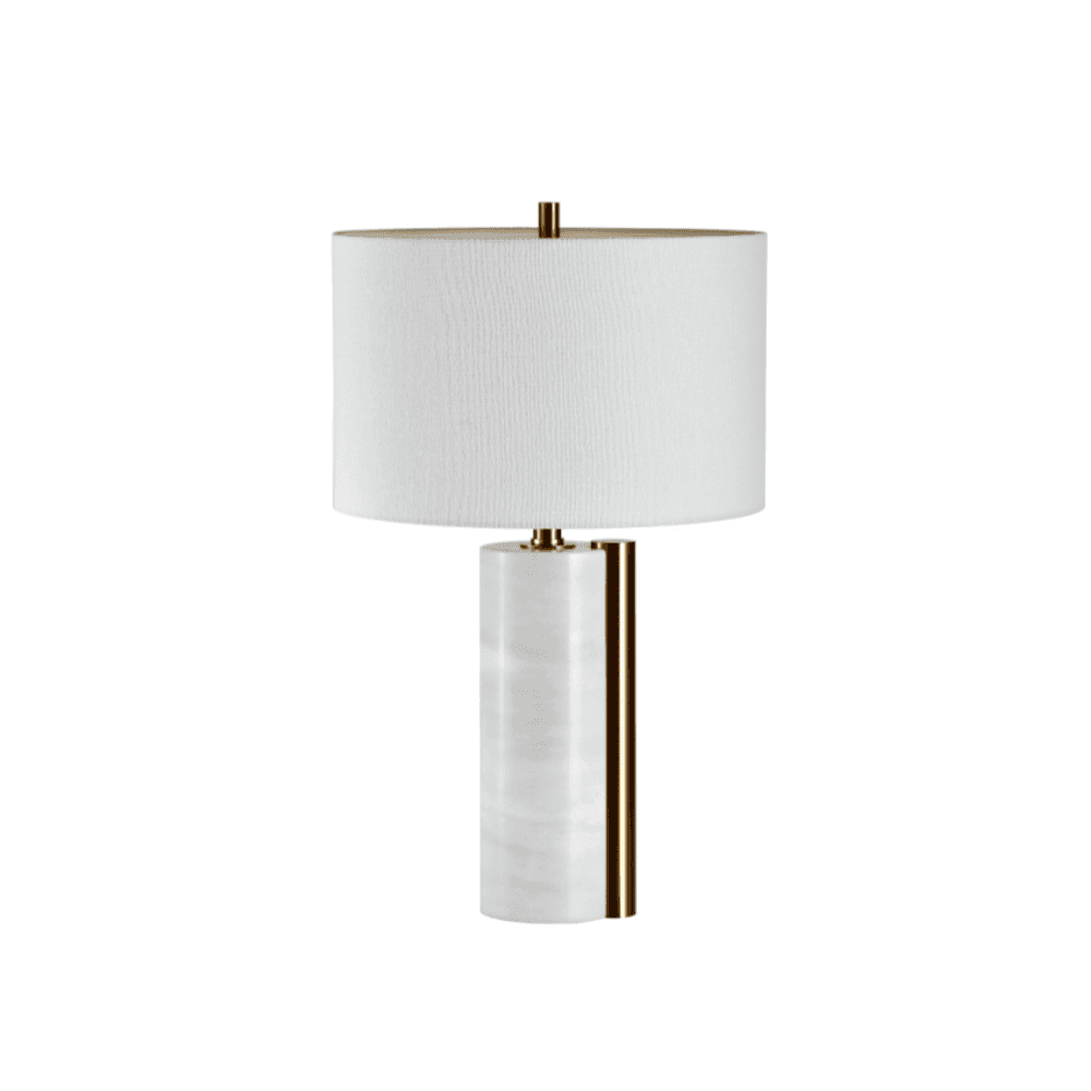 Marble-finished cylinder base with brass piping to side. Features a circular white shade. Brass Accents Sleek & Contemporary in design. Ideal for any room in the home.