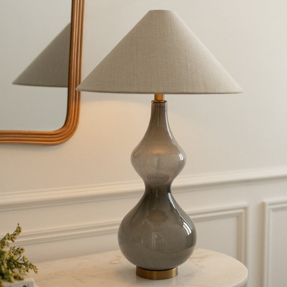 Shapely and elegant, the Effy table lamp is a refined statement piece that adds a subtle pop of colour. It features a hand-blown glass base with a softly frosted Sage finish, paired with a classic tapered shade.