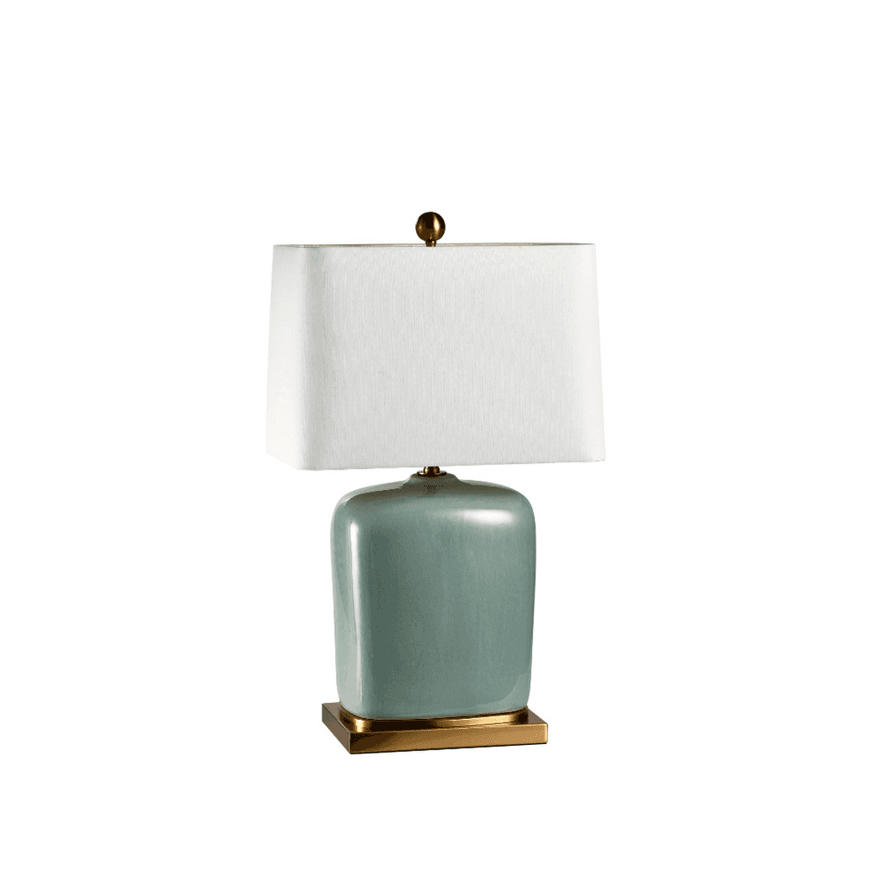 A stunning teal blue ceramic lamp with brass accents and a white rectangular shade. Ideal for any area in the home.