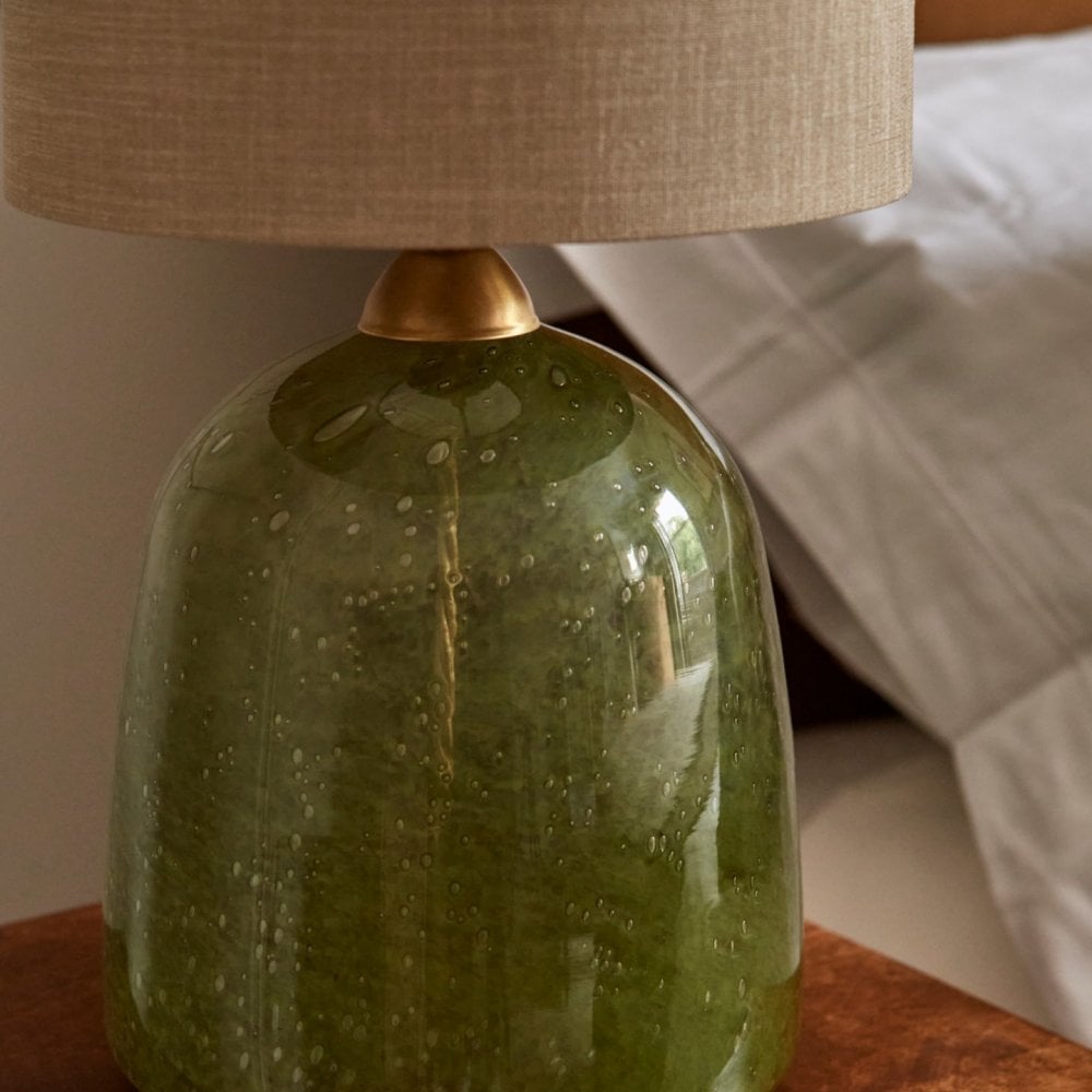 Our new Hazel table lamp started its life as a series of finishing experiments in a creative project with our highly skilled glass artists in Portugal. The moss green base is the result of a tireless development process undertaken to achieve just the right depth of colour and texture in the bubbled surface. The classic bell shaped form allows this special finish to take center stage.