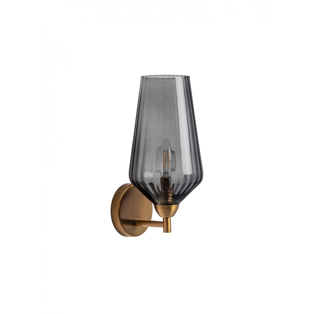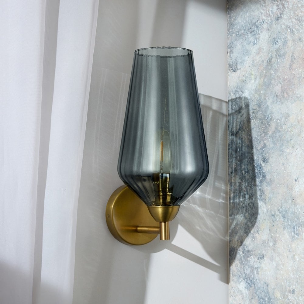With a fluted scalloped edge in an earthy Slate tone, the Heidi wall light is finished in antique brass and subtly reeded glass, which softly filters the light casting perfect reflections across its surroundings.