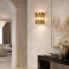 Interspersed among the metal framework are delicate tri-cut glass tubes, which bring a sense of delicacy and lightness to the wall bracket. These clear glass tri-cut tubes allowing the light to pass through and create a soft, warm ambiance when the wall light is illuminated.