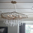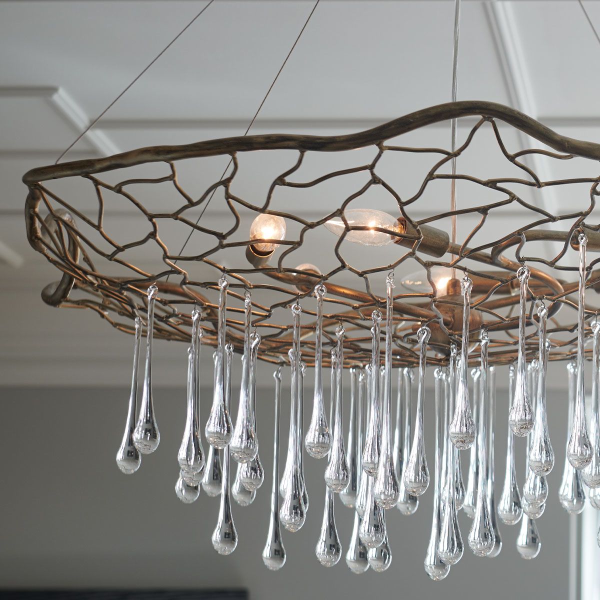Imagine a net gently breaking the surface, then slowly emerging with a cascade of water droplets trickling through and shimmering with light. Laguna designed by Lisa McDennon for Hinkley uses a hand-made open framework design in Brushed Gold as the foundation in this artistic interpretation. Clear glass droplets fall at varying lengths, casting the light. Minimal hanging wires ensure the net itself appears to float, as a candle cluster emits light from within.