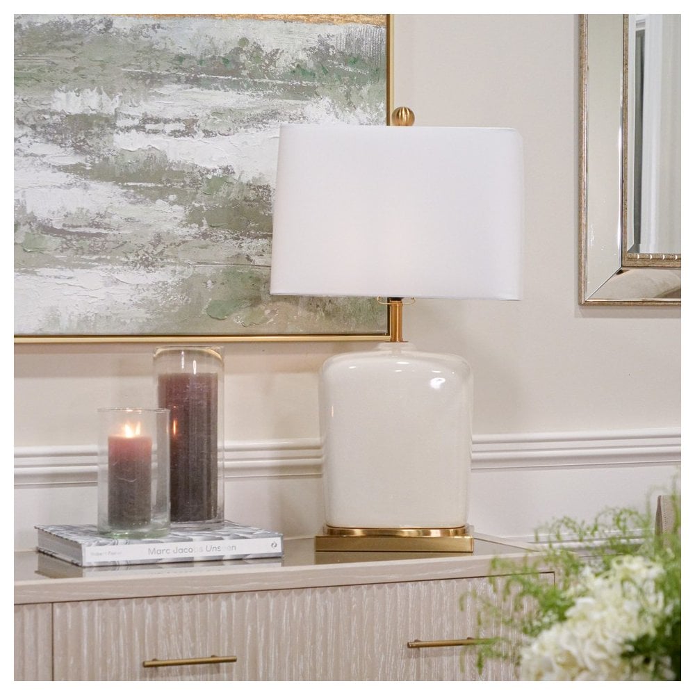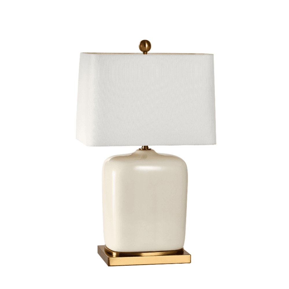 A stunning cream ceramic lamp with brass accents and a white rectangular shade. Ideal for any area in the home.