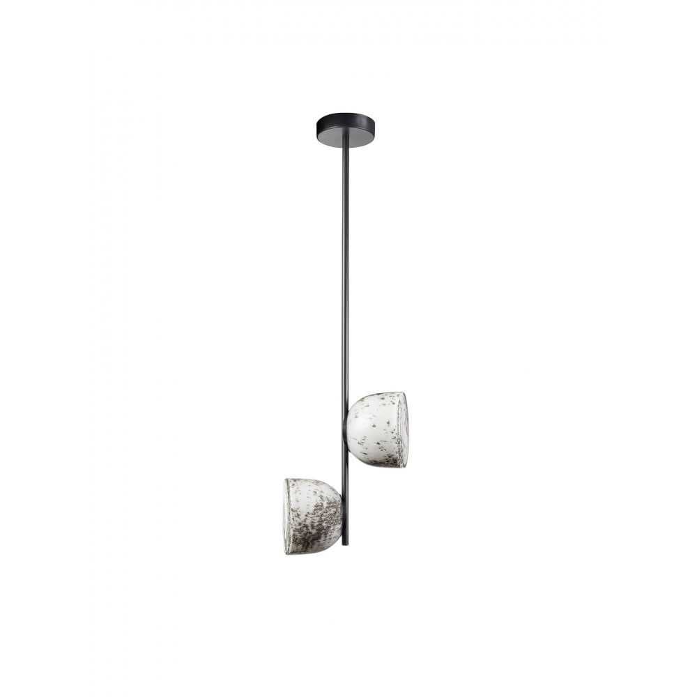 Positioned carefully around the minimal form of our Orla vertical pendant, multiple bowl shaped glasses frame the unique volcanic frit finish. Individually forged in the heat of the molten glass, metallic grains react across the surface, providing infinite variations of markings on each piece.