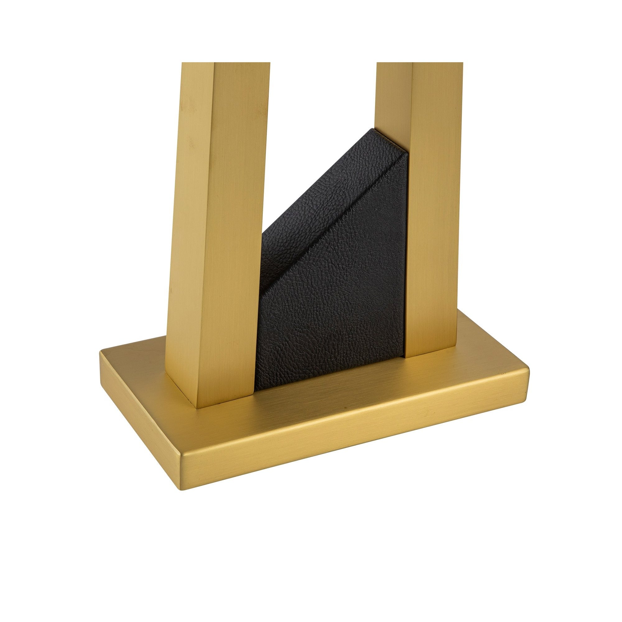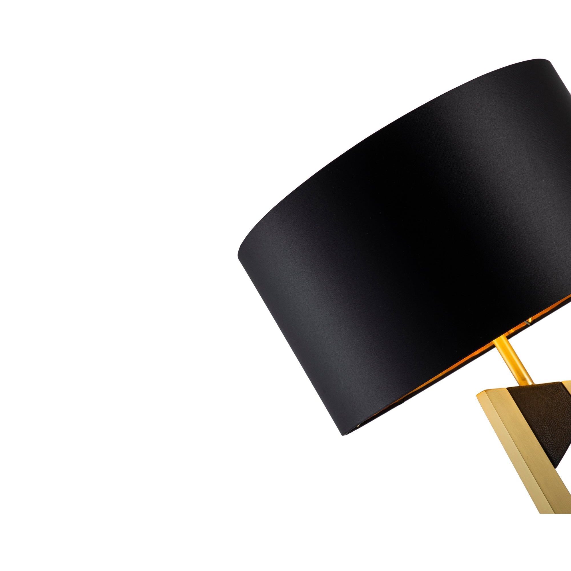 Illuminate your space with the Pharo Table Lamp, an exquisite piece featuring a matt brushed brass finish and luxurious black leather accents. Its sophisticated black fabric shade with a gold interior adds warmth to any room. Perfect for creating ambient lighting, this lamp combines artful design with functionality.
