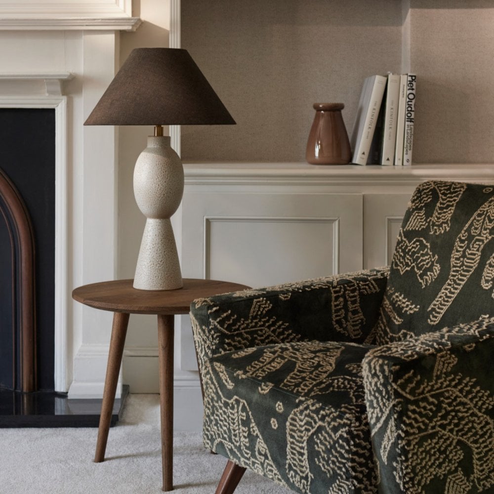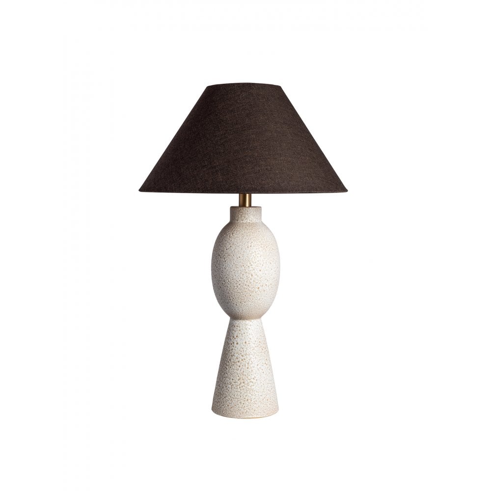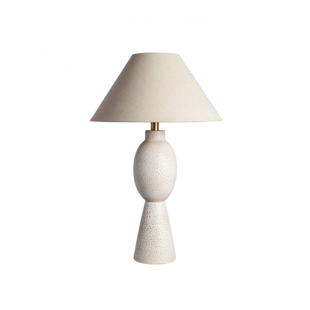 Remi, the newest edition to our ceramic family, celebrates form and feature. The base is washed with an artisanal reactive glaze that when heated in the kiln, creates tiny craters in the lamps surface – a speckling of sandy coloured stars distribute irregularly across the unique form.