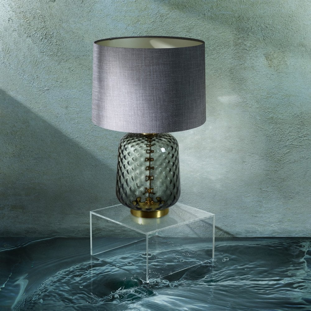 The Risco table lamp features hand-blown waterfall effect glass, available in 3 neutral colour options – Olive, Smoke and Clear.