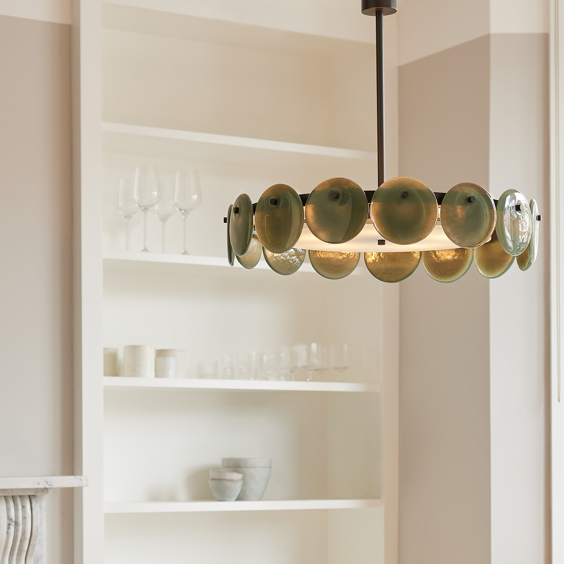 The Sierra Large Single Chandelier features sleek Blackened Bronze metalwork paired with hand poured glass discs in Chalk or Olive finish. The discs are evenly spaced around the frame and secured with decorative beads, adding a modern touch to any dining or sitting room.