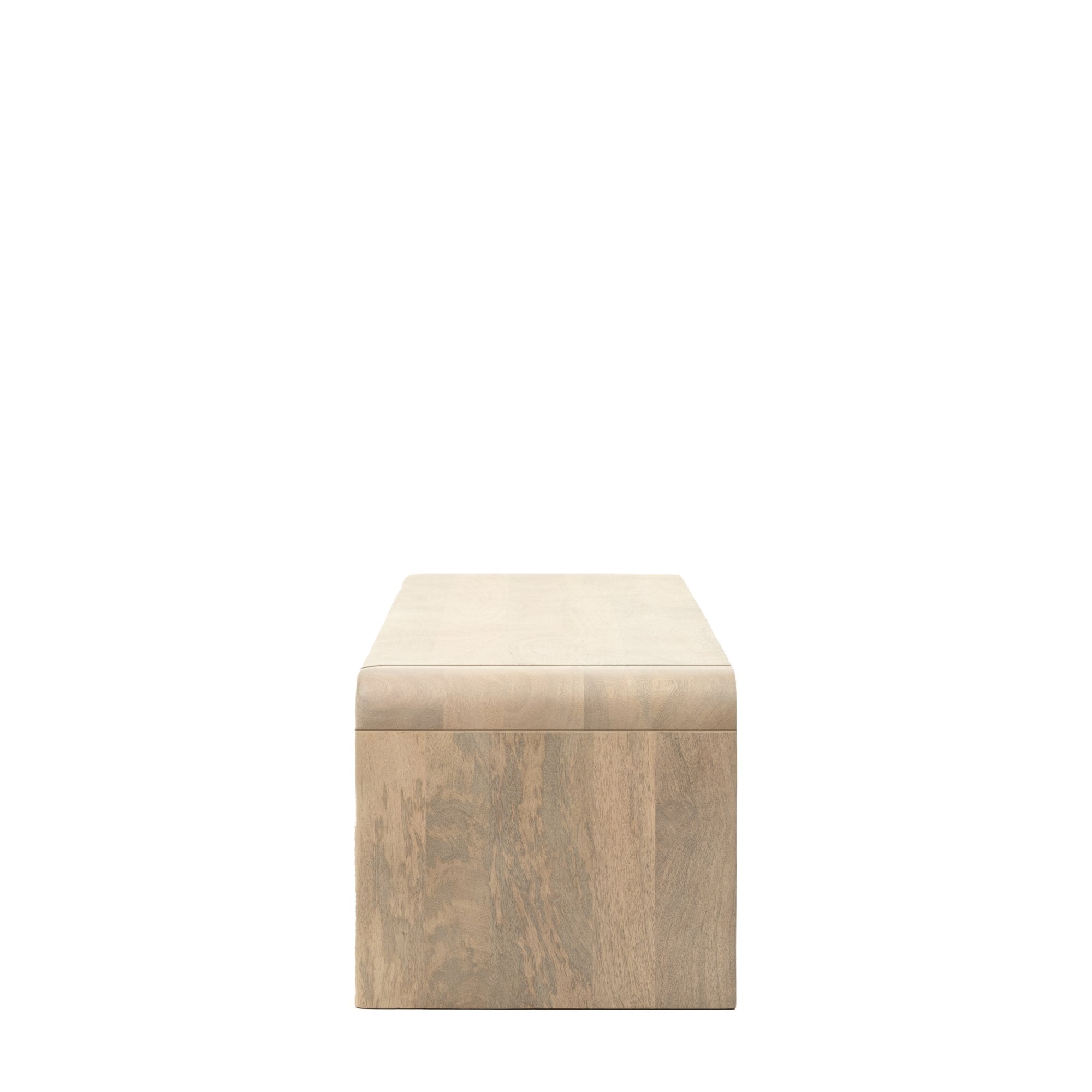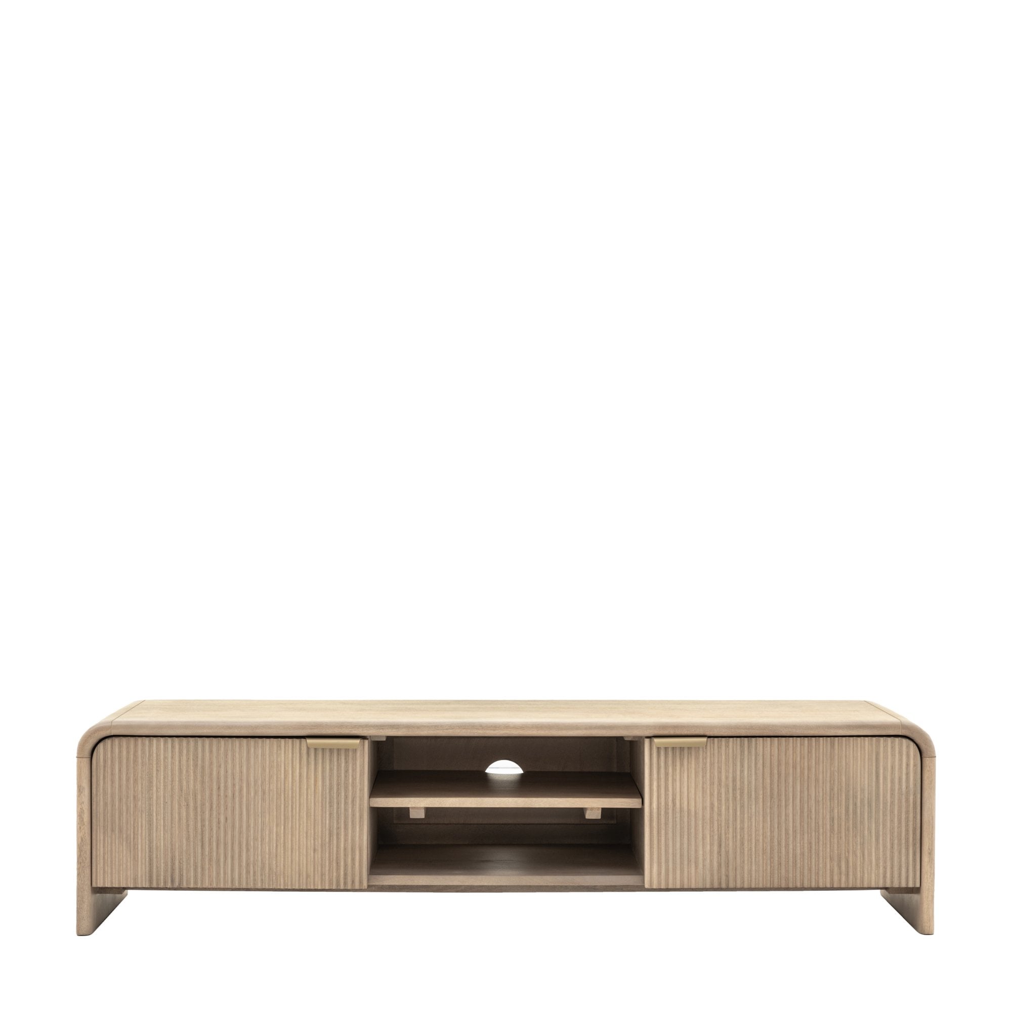 This media unit is a functional and stylish solution for media storage. With a curved top and fluted door detailing, it provides ample space for entertainment essentials. The sleek design fits effortlessly into modern living spaces, offering both organization and aesthetic appeal.
