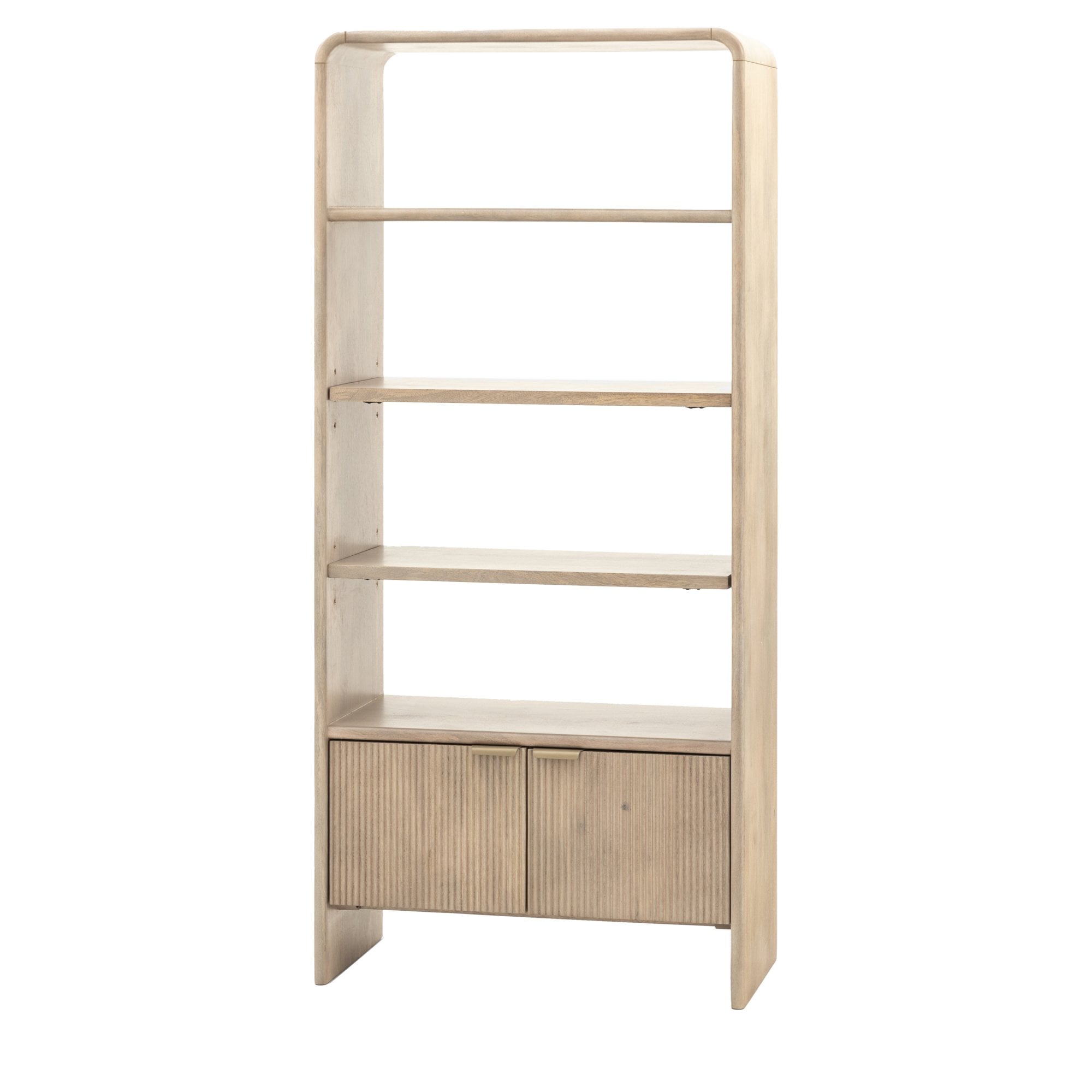 This open display offers an elegant way to showcase books, artwork, and collectibles. With a curved top and fluted detailing, this piece provides generous space for displaying items in a refined manner. Its vertical design is perfect for smaller spaces, enhancing any room with both functionality and sophistication.
