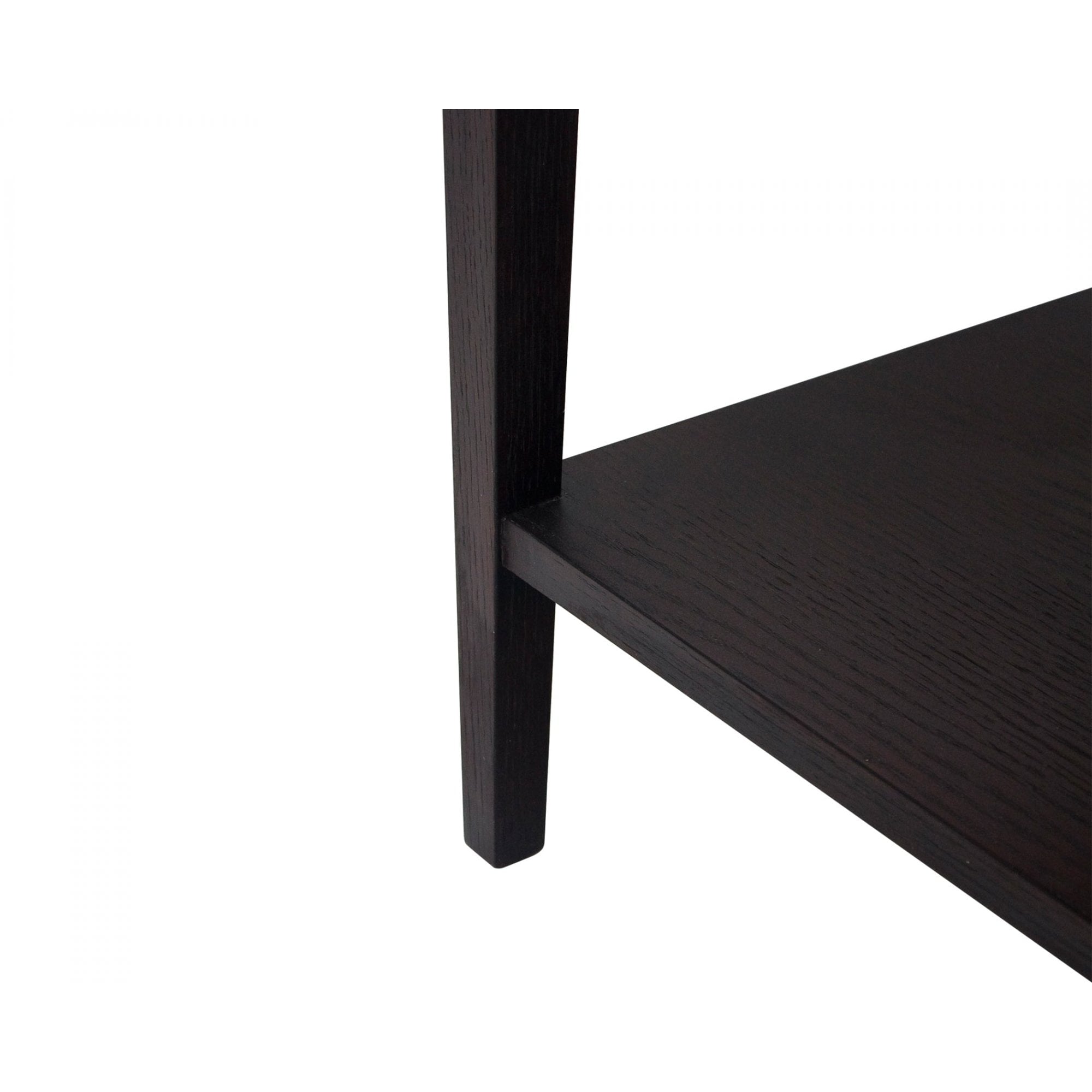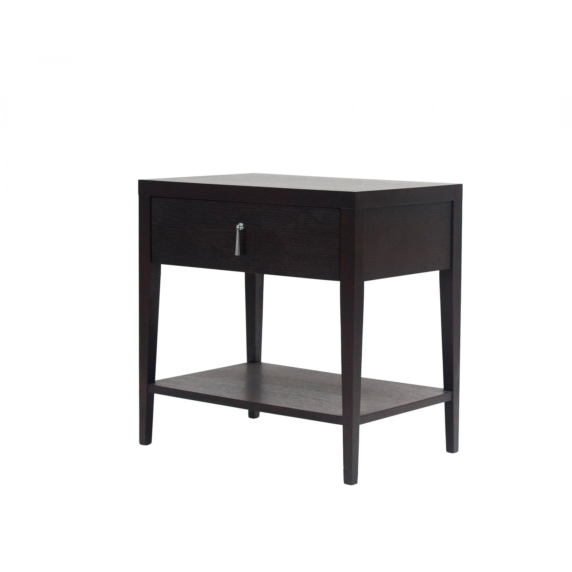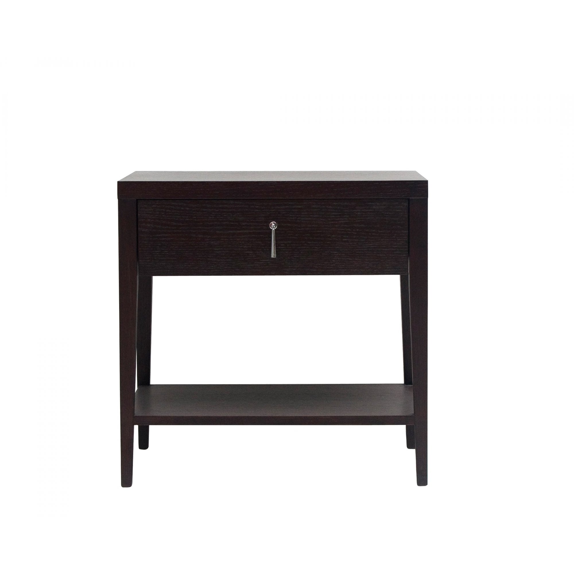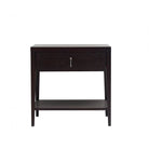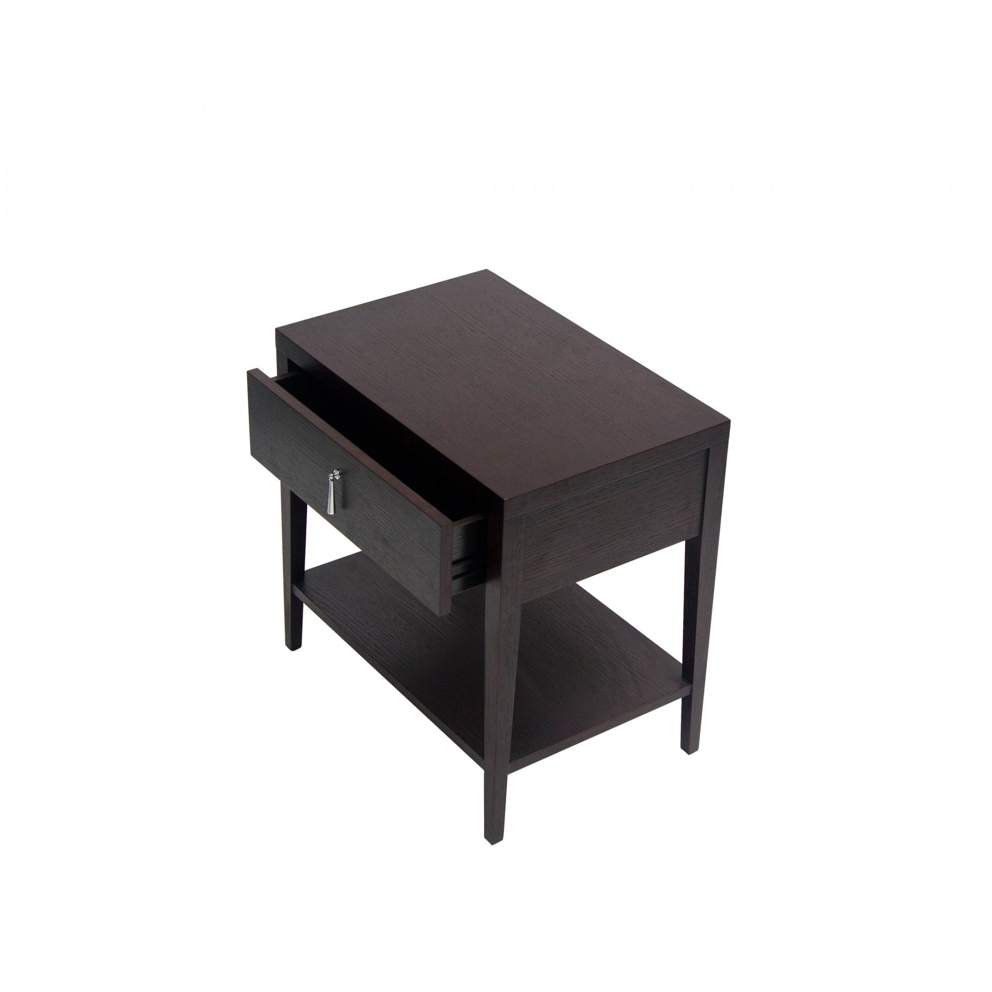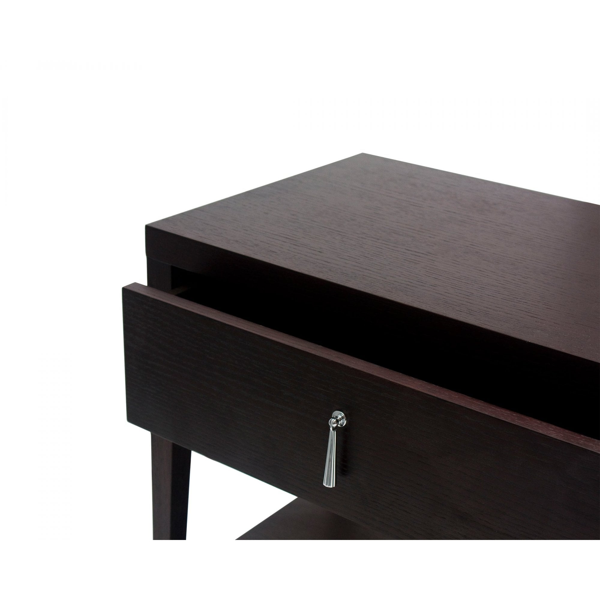 Elevate your bedroom decor with the Sina Bedside Table, a modern masterpiece in dark Wenge Oak veneer. This stylish piece features clean lines, solid wood legs, and a generous drawer with a polished chrome handle for luxury and practicality. Its soft-close mechanism adds convenience, making it perfect for contemporary living.